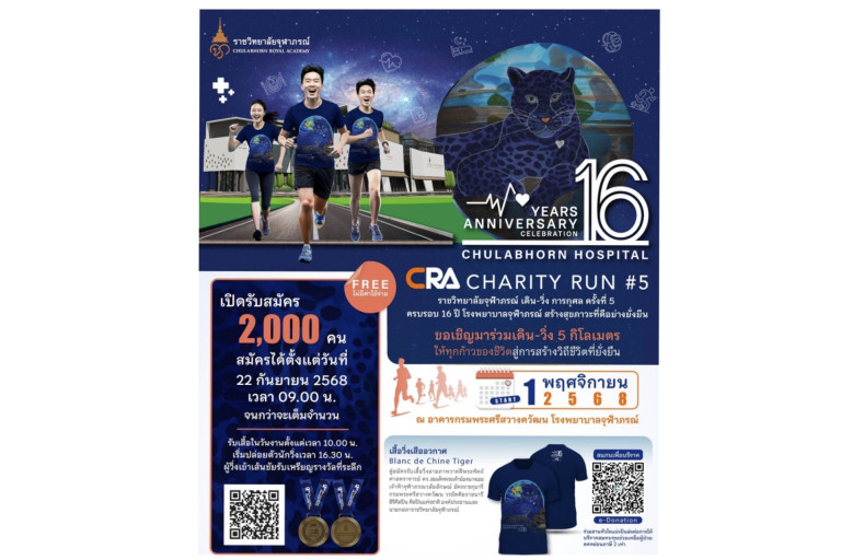 ราชวิทยาลัยจุฬาภรณ์ ขอเชิญผู้สนใจร่วมมหกรรมส่งเสริมสุขภาพเนื่องในโอกาสครบรอบ 16 ปี โรงพยาบาลจุฬาภรณ์ สร้างสุขภาวะที่ดีอย่างยั่งยืน 29 – 31ตุลาคม 2568 ณ ชั้น 6 Convention Hall อาคารกรมพระศรีสวางควัฒน โรงพยาบาลจุฬาภรณ์ พร้อมขอเชิญบุคลากร นักศึกษา ผู้รับบริการ และประชาชนมาร่วมออกกำลังกายเดิน-วิ่ง ฉลองครบรอบ 16 ปี โรงพยาบาลจุฬาภรณ์ ไปพร้อม ๆ กันในกิจกรรมราชวิทยาลัยจุฬาภรณ์ เดิน-วิ่ง การกุศล ครั้งที่ 5 CRA Charity Run#5 วันเสาร์ที่ 1 พฤศจิกายน 2568 ณ อาคารกรมพระศรีสวางควัฒน โรงพยาบาลจุฬาภรณ์ เปิดรับสมัครผู้ที่สนใจเข้าร่วมกิจกรรม จำนวน 2,000 คน โดยไม่เสียค่าใช้จ่ายวันจันทร์ที่ 22 กันยายน 2568 เวลา 9.00 น. จนกว่าจะเต็มจำนวน