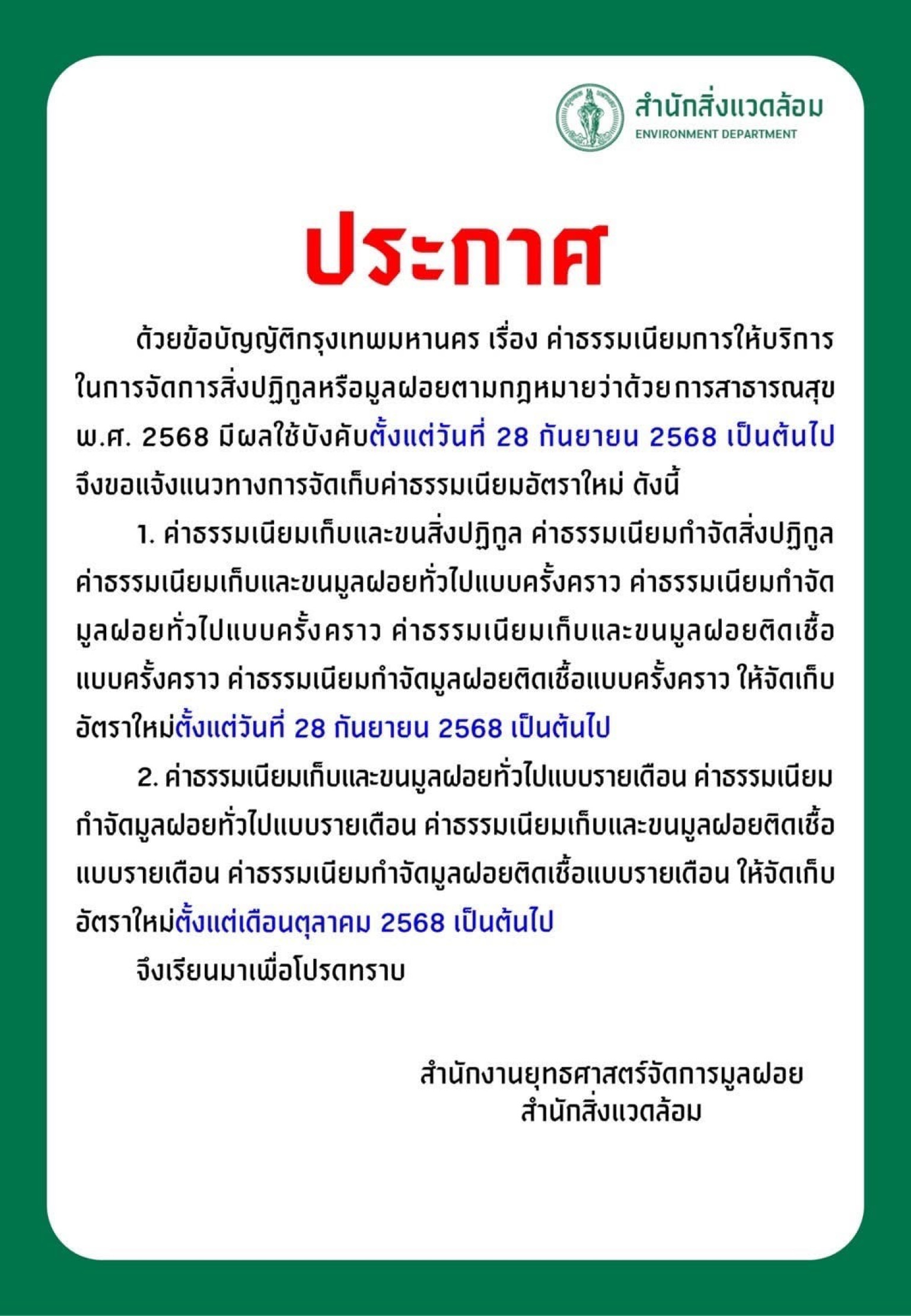 (21 ก.ย.68) กรุงเทพมหานคร (กทม.) ประกาศเตรียมปรับขึ้นอัตราค่าธรรมเนียมการจัดการสิ่งปฏิกูลและมูลฝอยใหม่ ตามข้อบัญญัติค่าธรรมเนียมการให้บริการในการจัดการสิ่งปฏิกูลฯ พ.ศ. 2568 ซึ่งจะมีผลบังคับใช้ตั้งแต่วันที่ 28 กันยายน 2568 เป็นต้นไป ส่งผลให้ค่าธรรมเนียมเก็บขยะสำหรับบ้านเรือนทั่วไปปรับขึ้นเป็น 60 บาทต่อเดือน อย่างไรก็ตาม กทม. ได้เปิดโอกาสให้ประชาชนสามารถจ่ายในอัตราเดิมที่ 20 บาทต่อเดือนได้ เพียงเข้าร่วมโครงการคัดแยกขยะก่อนทิ้ง