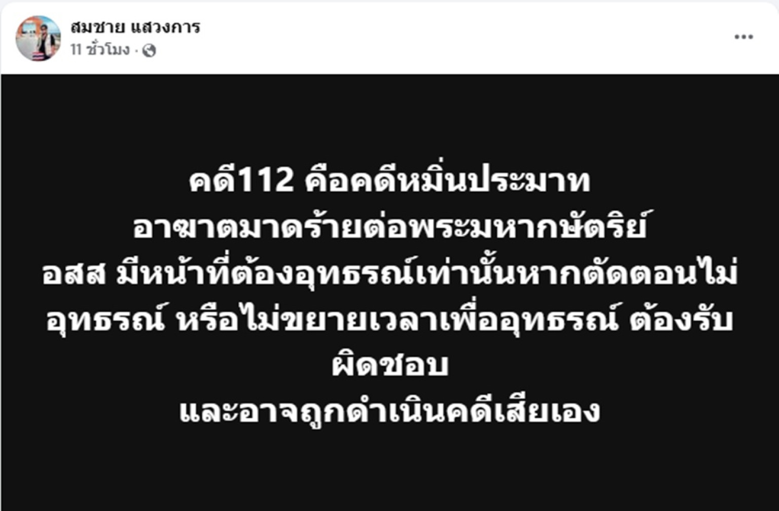 วันที่ 21 กันยายน 2568 นายสมชาย แสวงการ อดีตสมาชิกวุฒิสภา (อดีตสว.) โพสต์ข้อความ่านเฟซบุ๊ก ระบุว่า “คดี112 คือคดีหมิ่นประมาท อาฆาตมาดร้ายต่อพระมหากษัตริย์ อสส.มีหน้าที่ต้องอุทธรณ์เท่านั้น หากตัดตอนไม่อุทธรณ์ หรือไม่ขยายเวลาเพื่ออุทธรณ์ ต้องรับผิดชอบ และอาจถูกดำเนินคดีเสียเอง”