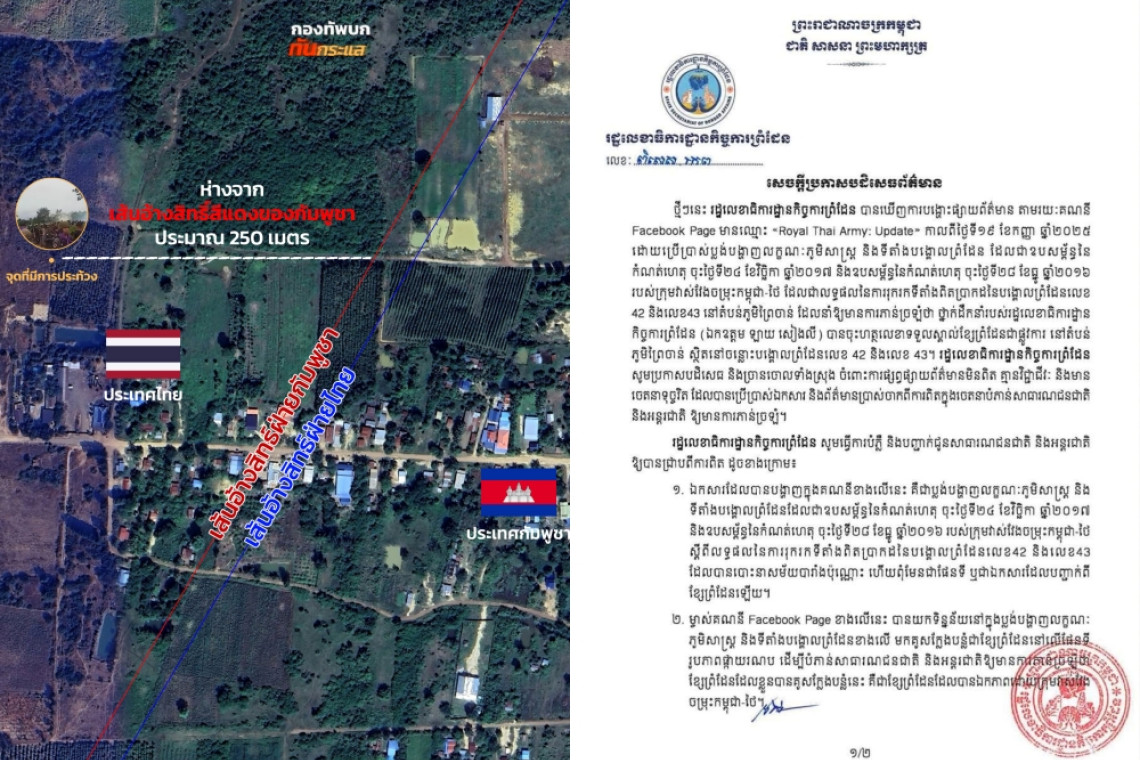 สำนักงานเลขาธิการคณะกรรมการเขตแดนของกัมพูชา ชี้แจงว่า เอกสารที่โพสต์โดยเพจดังกล่าว เป็นเพียงแผนผังที่แสดงลักษณะทางภูมิศาสตร์และตำแหน่งของหลักเขตแดน ซึ่งเป็นภาคผนวกของบันทึกการประชุมลงวันที่ 24 พฤศจิกายน 2017 และ 28 ธันวาคม 2016 ของคณะทำงานสำรวจร่วมกัมพูชา-ไทย ว่าด้วยผลการตรวจสอบตำแหน่งจริงของหลักเขตแดนหมายเลข 42 และ 43 ที่เคยปักไว้ในสมัยฝรั่งเศสเท่านั้น ไม่ใช่แผนที่หรือเอกสารที่แสดงหรือยืนยันถึงเส้นเขตแดนอย่างเป็นทางการแต่อย่างใด