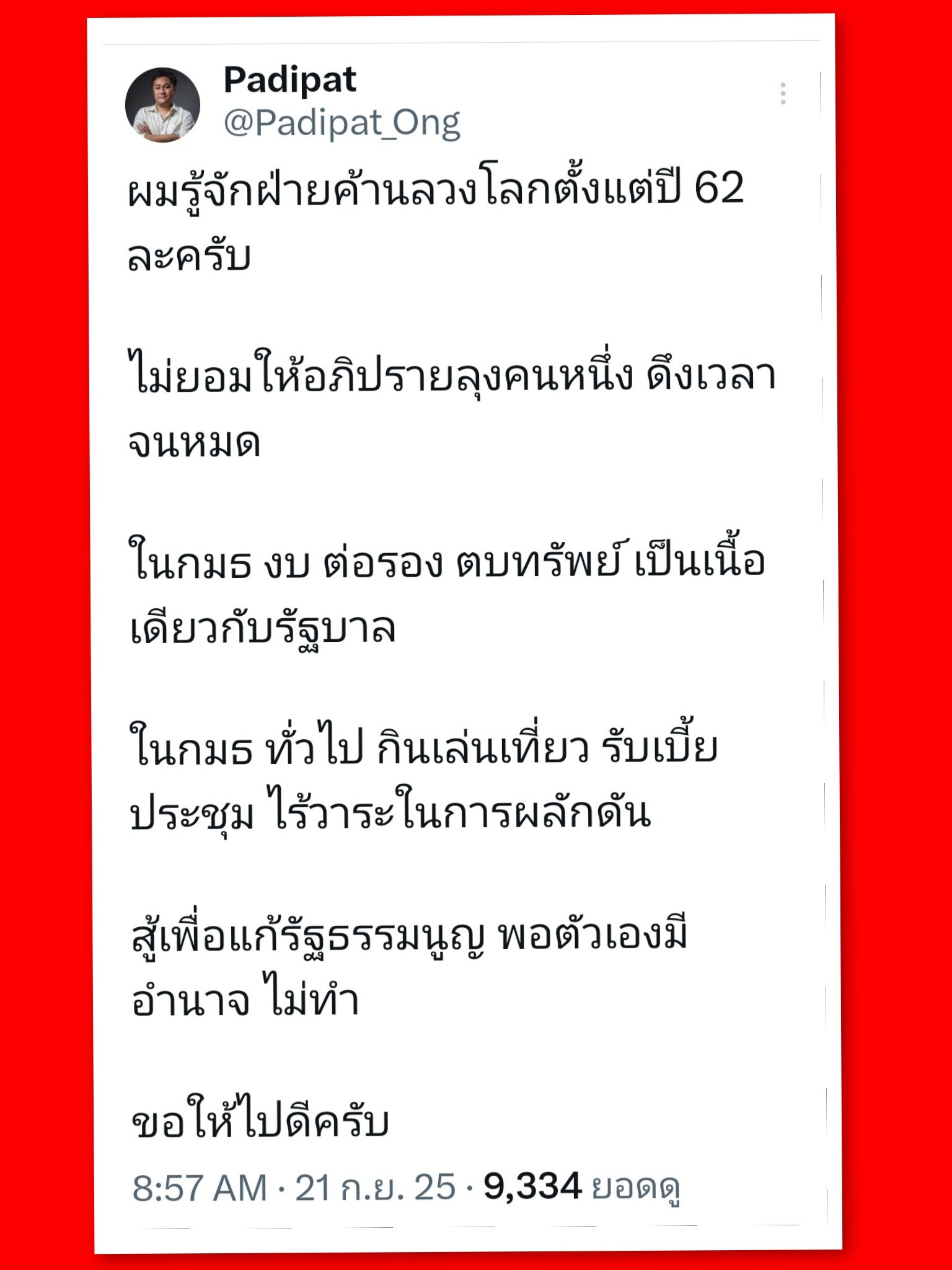 สำหรับข้อความดังกล่าวระบุว่า " ผมรู้จักฝ่ายค้านลวงโลกตั้งแต่ปี 62 ละครับ ไม่ยอมให้อภิปรายลุงคนหนึ่ง ถึงเวลา จนหมด ในกมธ งบ ต่อรอง ตบทรัพย์ เป็นเนื้อเดียวกับรัฐบาล ในกมธ ทั่วไป กินเล่นเที่ยว รับเบี้ยประชุม ไร้วาระในการผลักดัน สู้เพื่อแก้รัฐธรรมนูญ พอตัวเองมีอ่านาจไม่ทำ ขอให้ไปดีครับ"