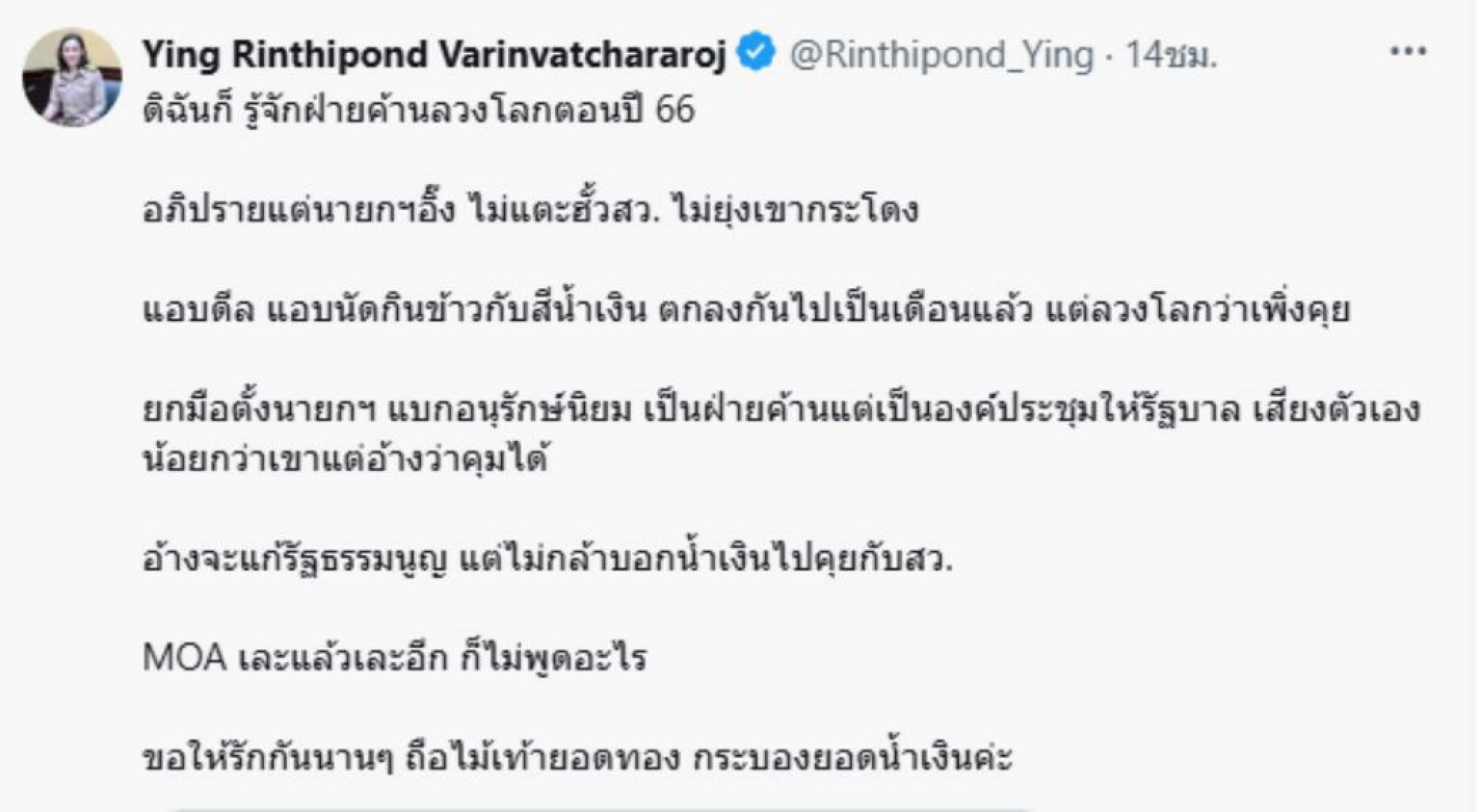 ดิฉันก็ รู้จักฝ่ายค้านลวงโลกตอนปี 66 อภิปรายแต่นายกฯอิ๊ง ไม่แตะฮั้วสว. ไม่ยุ่งเขากระโดง แอบดีล แอบนัดกินข้าวกับสีน้ำเงิน ตกลงกันไปเป็นเดือนแล้ว แต่ลวงโลกว่าเพิ่งคุย ยกมือตั้งนายกฯ แบกอนุรักษ์นิยม เป็นฝ่ายค้านแต่เป็นองค์ประชุมให้รัฐบาล เสียงตัวเองน้อยกว่าเขาแต่อ้างว่าคุมได้ อ้างจะแก้รัฐธรรมนูญ แต่ไม่กล้าบอกน้ำเงินไปคุยกับสว. MOA เละแล้วเละอีก ก็ไม่พูดอะไร ขอให้รักกันนานๆ ถือไม้เท้ายอดทอง กระบองยอดน้ำเงินค่ะ