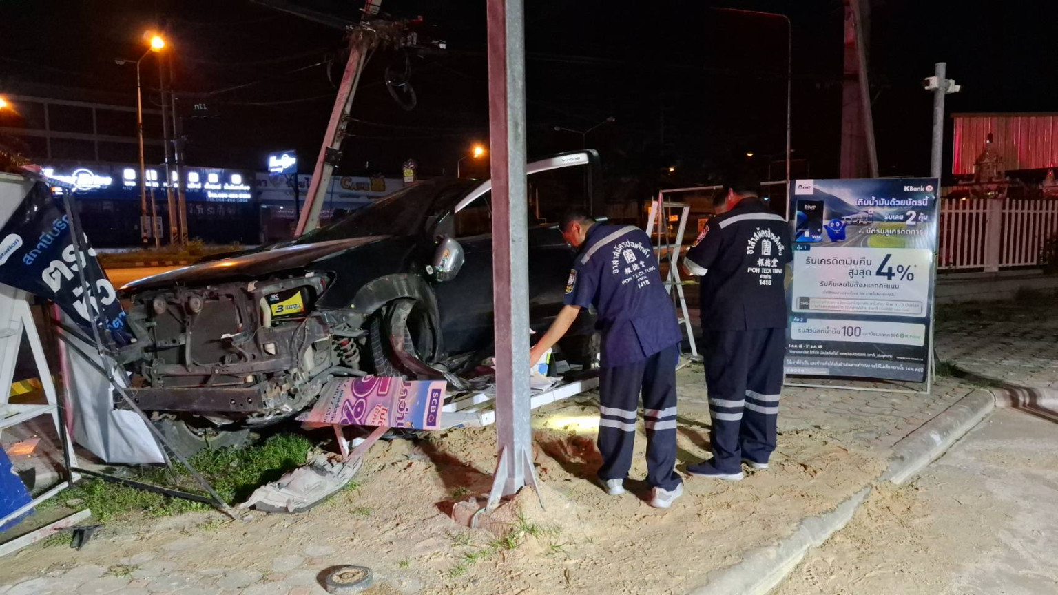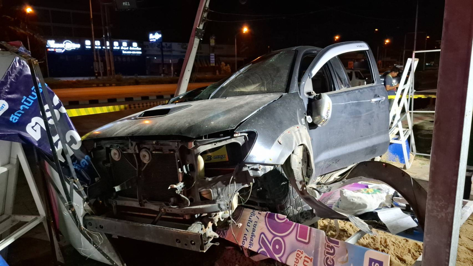 จากการสอบถามนายภมรินทร์ (สงวนนามสกุล) คนขับไลน์แมน กล่าวว่า ในช่วงเวลาดังกล่าวตนเองได้จอดรถอยู่ภายในปั๊มเพื่อชาร์จ แบตเตอรี่รถยนต์ ขณะนั้นได้มีเสียงรถเบรคลากยาว บนถนน ช่วงลงสะพานข้ามแยกสันติสุข ตนเองจึงหันไปดูจากนั้นมีรถกระบะ สีดำได้พุ่งมาชนเสาไฟฟ้าหน้าปั๊ม ตนเองจึงวิ่งมาดู และแจ้งเจ้าหน้าที่เพื่อเข้าช่วยเหลือ
