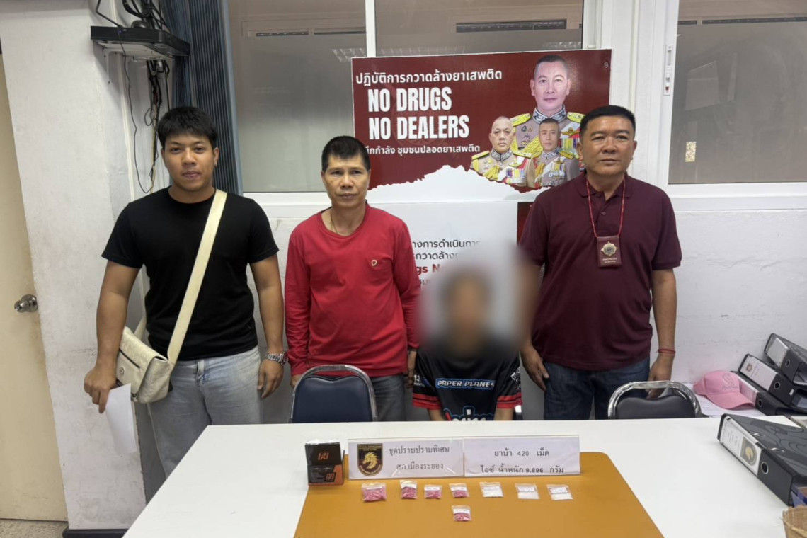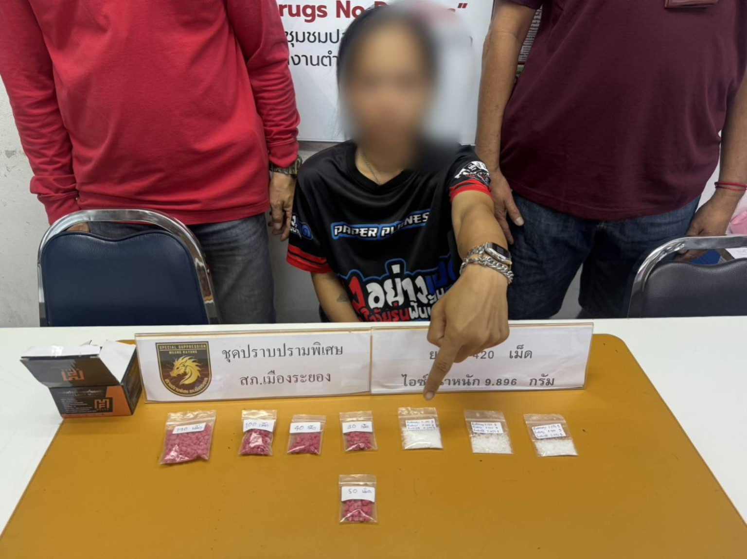 เมื่อวันที่ 22 กันยายน 2568 พ.ต.อ.อาทิตย์ ยาแก้ว ผกก.สภ.เมืองระยอง พร้อมด้วยพ.ต.ท.ศักดิ์ชัย บูรณ์เจริญ สวป.สภ.เมืองระยอง ร.ต.ท.ณัฐพลวัฒน์ ศรีวิชา รอง สวป.สภ.เมืองระยอง และจนท.ตร.ชุดปราบปราบพิเศษ สภ.เมืองระยอง ร่วมกันจับกุม น.ส.ณัฐมล หรืออ้อแอ้ อายุ 24 ปี ชาวจังหวัดหนองคาย พร้อมด้วยของกลาง ยาบ้า 420 เม็ด ไอซ์ 9.896 กรัม ธนบัตรใบละ 500 บาท จำนวน 1 ใบ