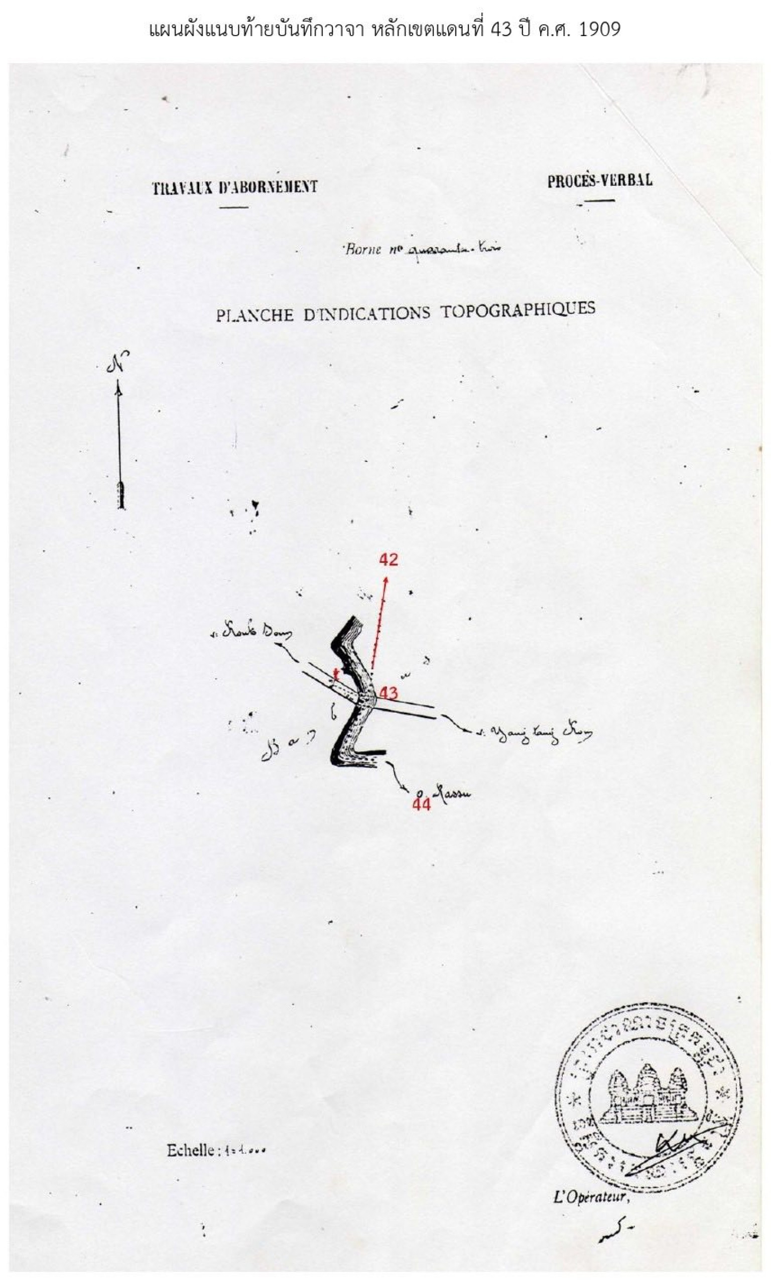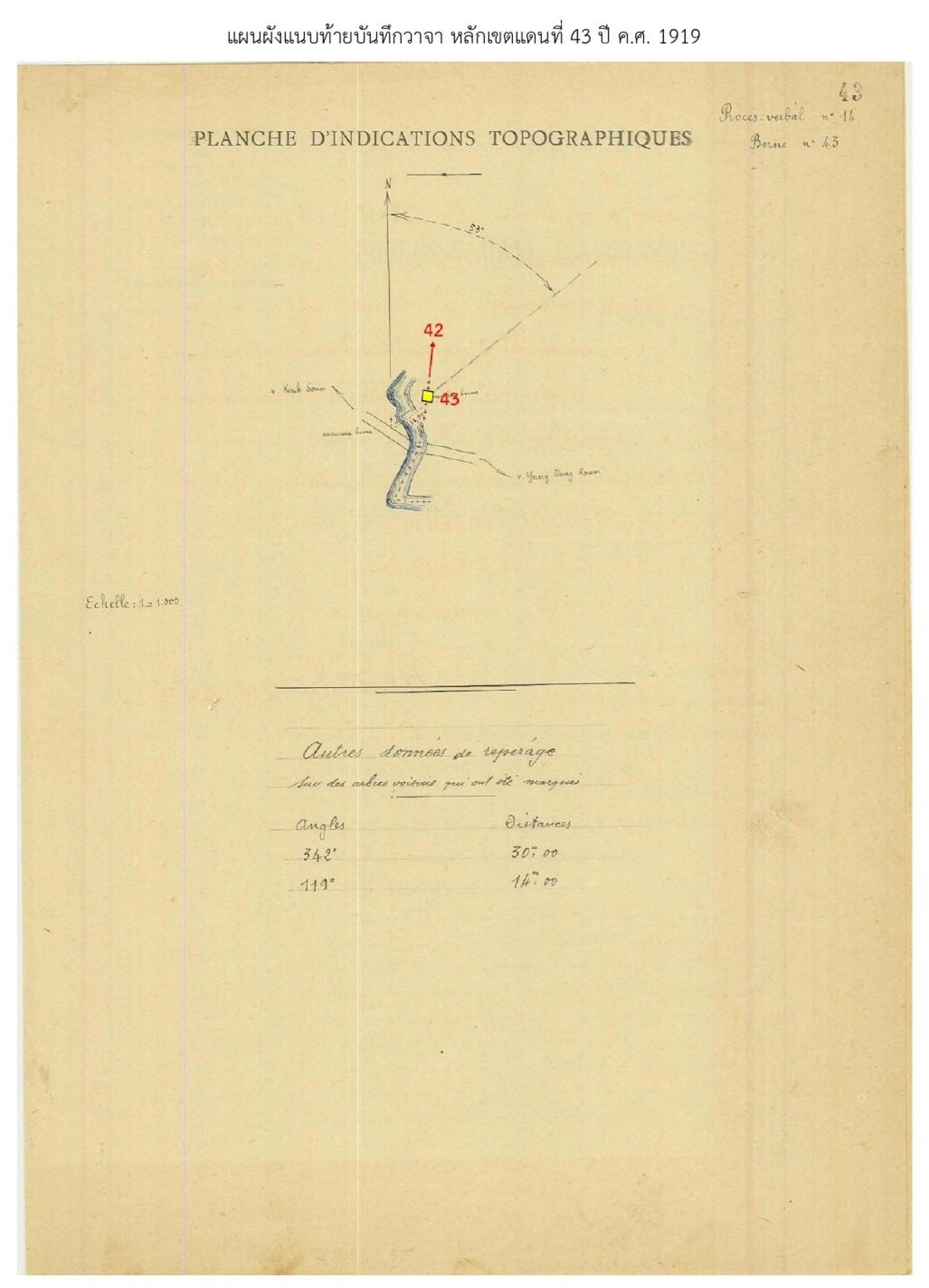 สำหรับบันทึกวาจาและแผนผังแสดงที่ตั้งหลักเขตแดนที่ 42 และ 43 เป็นบันทึกของข้าหลวงปักหลักเขตแดนระหว่างประเทศสยามกับอินโดจีนของฝรั่งเศส จัดทำขึ้นเมื่อปี ค.ศ. 1908–1909 โดยใช้ต้นไม้หรือเสาไม้ติดแผ่นโลหะเป็นหลักเขตแดน ต่อมาในปี ค.ศ. 1919–1920 ได้เปลี่ยนเป็นหลักคอนกรีตทดแทนซึ่งตั้งอยู่ใกล้กับหลักไม้หรือเสาไม้เดิม โดยในแผนผังแสดงที่ตั้งหลักเขตแดนของบันทึกวาจาทั้งสองห้วง ได้กำหนดแนวเขตแดนเป็นเส้นตรงระหว่างหลักที่ 42 และ 43 โดยแนวเส้นตรงดังกล่าวผ่านกึ่งกลางของหลักเขตแดนทั้งสองอย่างชัดเจน
