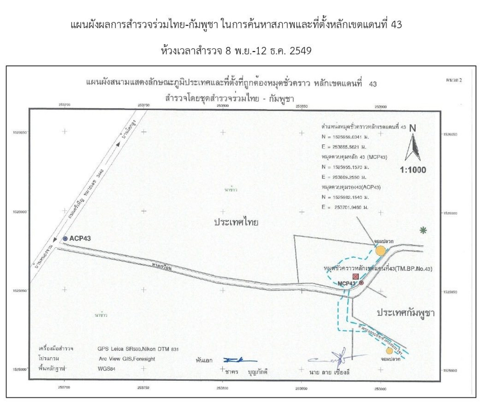 สำหรับกระบวนการสำรวจ ชุดสำรวจร่วมไทย–กัมพูชาได้ดำเนินการตามขั้นตอนที่ 1 ของ TOR คือ การสำรวจสภาพ และที่ตั้งของหลักเขตแดนทั้งหมด 74 หลัก ตั้งแต่ปี พ.ศ. 2549 โดยในส่วนของหลักเขตแดนที่ 42 ได้สำรวจเมื่อวันที่ 2–29 ตุลาคม 2549 พบว่ายังอยู่ในสภาพดี แต่ทั้งสองฝ่ายมีความเห็นแตกต่างกันในเรื่องที่ตั้ง ประมาณ 80 เมตร ส่วนหลักเขตแดนที่ 43 ได้สำรวจเมื่อวันที่ 8 พฤศจิกายน–12 ธันวาคม 2549 พบว่าหลักล้ม และถูกฝังอยู่ในดิน อย่างไรก็ตามทั้งสองฝ่ายสามารถตกลงที่ตั้งที่ถูกต้องร่วมกันได้ และได้สร้างหมุดชั่วคราว (Temporary Marker: TM) ไว้ ณ ตำแหน่งดังกล่าว
