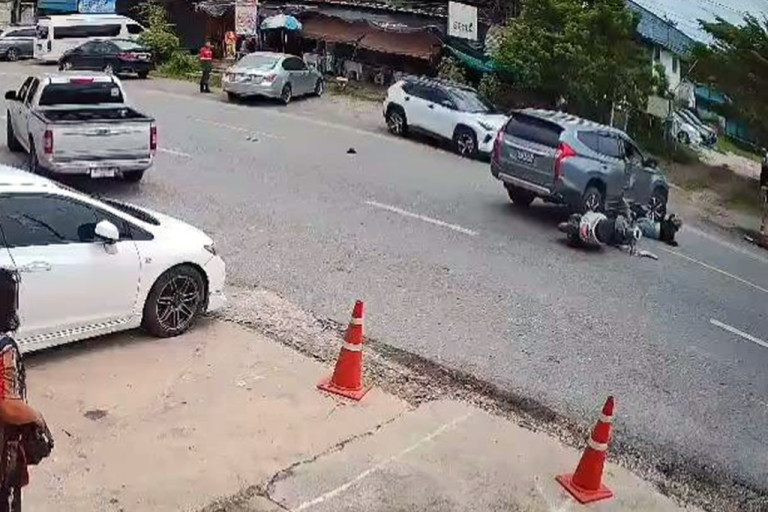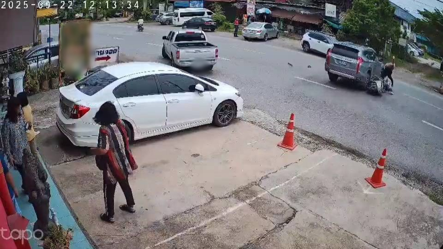 กล้องวงจรปิดเผยเหตุเก๋งเลี้ยวกลับรถกะทันหัน จยย.เบรกไม่ทันพุ่งชนกลางถนน คนขี่บาดเจ็บสาหัส ตร.เร่งตรวจสอบหาสาเหตุ