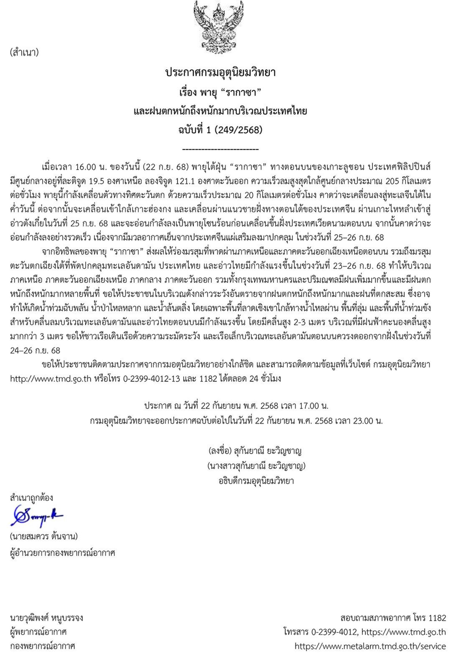 เมื่อเวลา 17.00 น.วันที่ 22 กันยายน 2568 กรมอุตุนิยมวิทยา ประกาศเรื่อง พายุ "รากาซา" และฝนตกหนักถึงหนักมากบริเวณประเทศไทย ฉบับที่ 1 (249/2568) ระบุว่า เมื่อเวลา 16.00 น.ของวันนี้ (22 ก.ย.68) พายุไต้ฝุ่น "รากาซา" ทางตอนบนของเกาะลูซอน ประเทศฟิลิปปินส์มีศูนย์กลางอยู่ที่ละติจูด 19.5 องศาเหนือ ลองจิจูด 121.1 องศาตะวันออก ความเร็วลมสูงสุดใกล้ศูนย์กลางประมาณ 205 กิโลเมตรต่อชั่วโมง พายุนี้กำลังเคลื่อนตัวทางทิศตะวันตก ด้วยความเร็วประมาณ 20 กิโลเมตรต่อชั่วโมง คาดว่าจะเคลื่อนลงสู่ทะเลจีนใต้ในค่ำวันนี้ ต่อจากนั้นจะเคลื่อนเข้าใกล้เกาะฮ่องกง และเคลื่อนผ่านแนวชายฝั่งทางตอนใต้ของประเทศจีน ผ่านเกาะไหหลำเข้าสู่อ่าวตังเกี๋ยในวันที่ 25 ก.ย.68 และจะอ่อนกำลังลงเป็นพายุโซนร้อนก่อนเคลื่อนขึ้นฝั่งประเทศเวียดนามตอนบน จากนั้นคาดว่าจะอ่อนกำลังลงอย่างรวดเร็ว เนื่องจากมีมวลอากาศเย็นจากประเทศจีนแผ่เสริมลงมาปกคลุม ในช่วงวันที่ 25 - 26 ก.ย.68