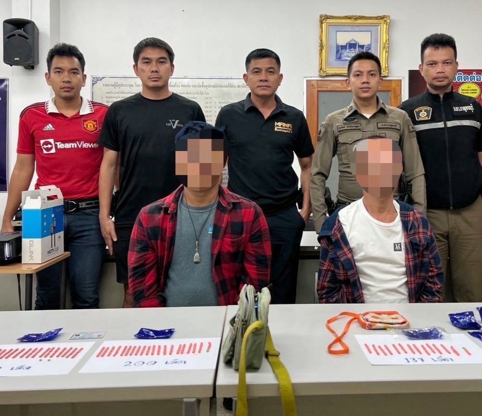 จากนั้นเจ้าหน้าที่ขยายผลจับกุม นายไพรัช ได้ที่บ้านพัก พร้อมตรวจยึดยาบ้าในกระเป๋าและกล่องพลาสติกเพิ่มเติม รวมของกลางทั้งหมด 2,393 เม็ด ผู้ต้องหาทั้งสองรับสารภาพว่าเตรียมจำหน่ายให้ลูกค้าในพื้นที่