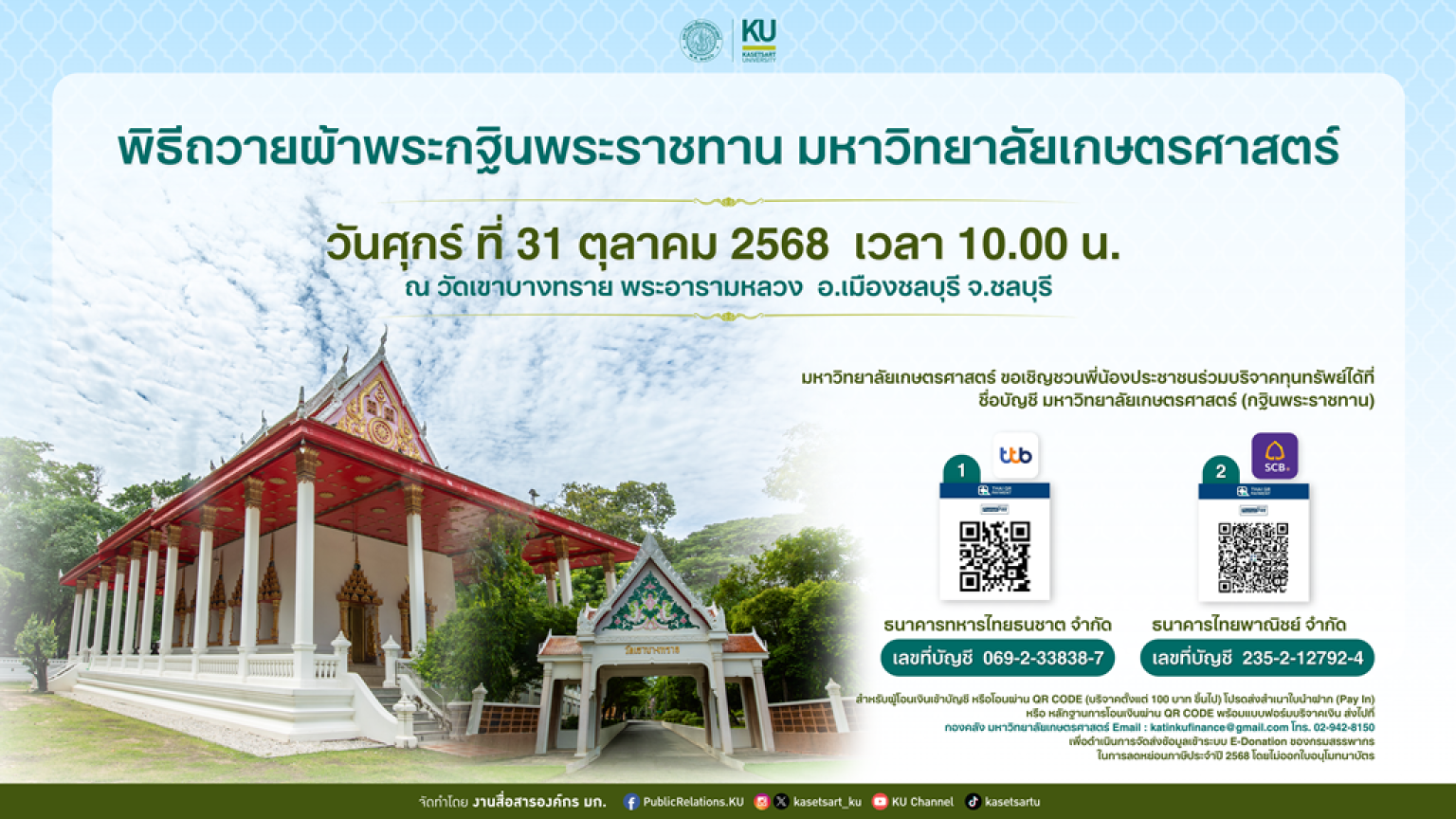 มหาวิทยาลัยเกษตรศาสตร์ ได้รับพระมหากรุณาธิคุณ จากพระบาทสมเด็จพระเจ้าอยู่หัว ทรงพระกรุณาโปรดเกล้า ฯ พระราชทานผ้าพระกฐิน ประจำปี 2568 ให้มหาวิทยาลัยเกษตรศาสตร์ น้อมนำไปถวาย ณ พระอารามหลวง วัดเขาบางทราย อำเภอเมือง จังหวัดชลบุรี ในวันศุกร์ที่ 31 ตุลาคม พ.ศ.2568 เวลา10.00 น.