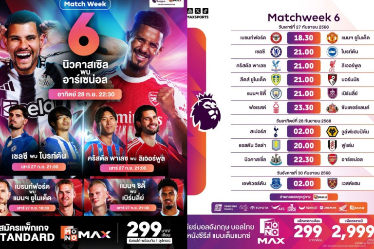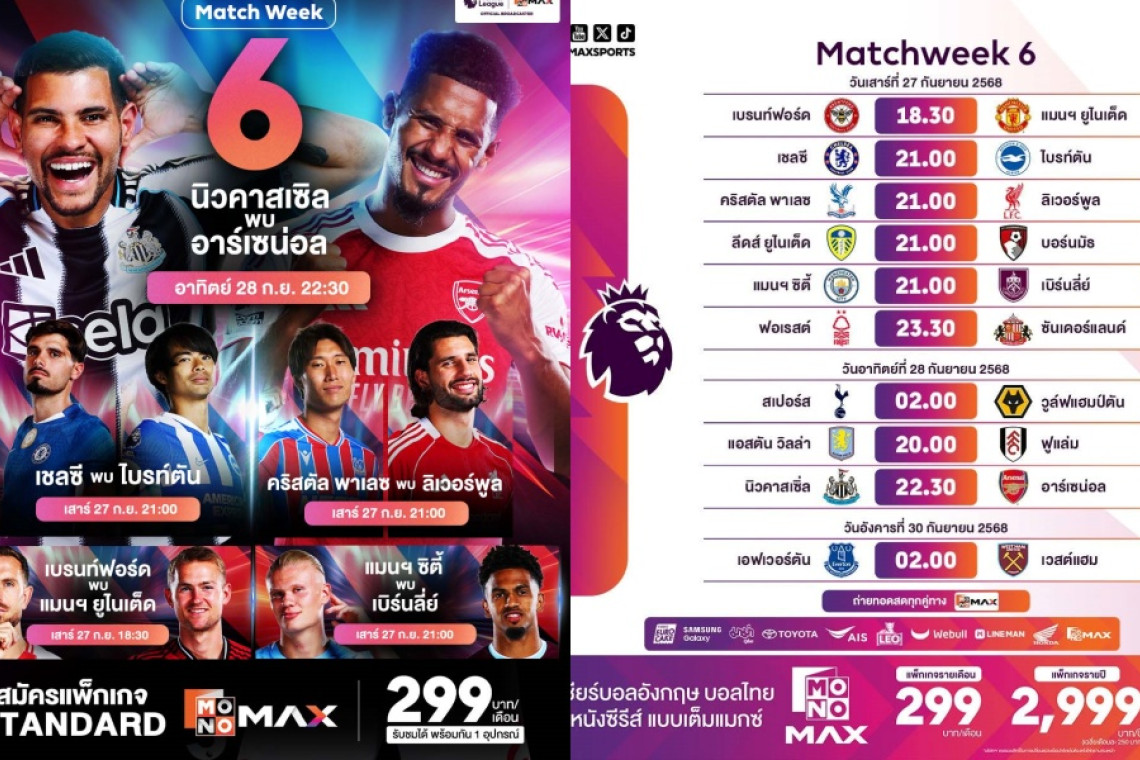 เริ่มต้นความเร้าใจใน วันเสาร์ที่ 27 สิงหาคม 2568 เวลา 18:30 น. รับชมทาง Monomax เมื่อ “ผึ้งมหาภัย” เบรนท์ฟอร์ด เปิดรังรับมือ “ปีศาจแดง” แมนเชสเตอร์ ยูไนเต็ด เกมนี้แฟนบอลรอชมว่าพลังบุกของยูไนเต็ดจะต้านทานเจ้าถิ่นที่เล่นในบ้านอย่างดุดันได้หรือไม่ จากนั้น เวลา 21.00 น. ความมันส์เดินหน้าต่อเนื่องพร้อมกันถึง 4 คู่เต็ม! เชลซี พบ ไบรท์ตัน & โฮฟ อัลเบี้ยน “สิงห์บลูส์” ต้องเจอเกมรุกของ “นกนางนวล” รับชมทาง Monomax, คริสตัล พาเลซ พบ ลิเวอร์พูล ดวลเดือดระหว่างแนวรับเจ้าถิ่นที่แข็งแกร่งกับแนวรุกจัดจ้านของ “หงส์แดง” รับชมทาง Monomax, ลีดส์ ยูไนเต็ด พบ บอร์นมัธ แมตช์ดวลพลังหนุ่ม เกมเร็ววิ่งสู้ฟัดเต็มสนาม รับชมทาง Monomax และ แมนเชสเตอร์ ซิตี้ พบ เบิร์นลีย์ บิ๊กแมตช์ที่ “เรือใบสีฟ้า” เต็งแชมป์จะได้พิสูจน์พลังรุกในบ้าน โดยมี “เดอะ คลาเร็ตส์” พร้อมสู้ไม่ถอย ถ่ายทอดสดพิเศษทั้งทาง Monomax และ ช่อง MONO29