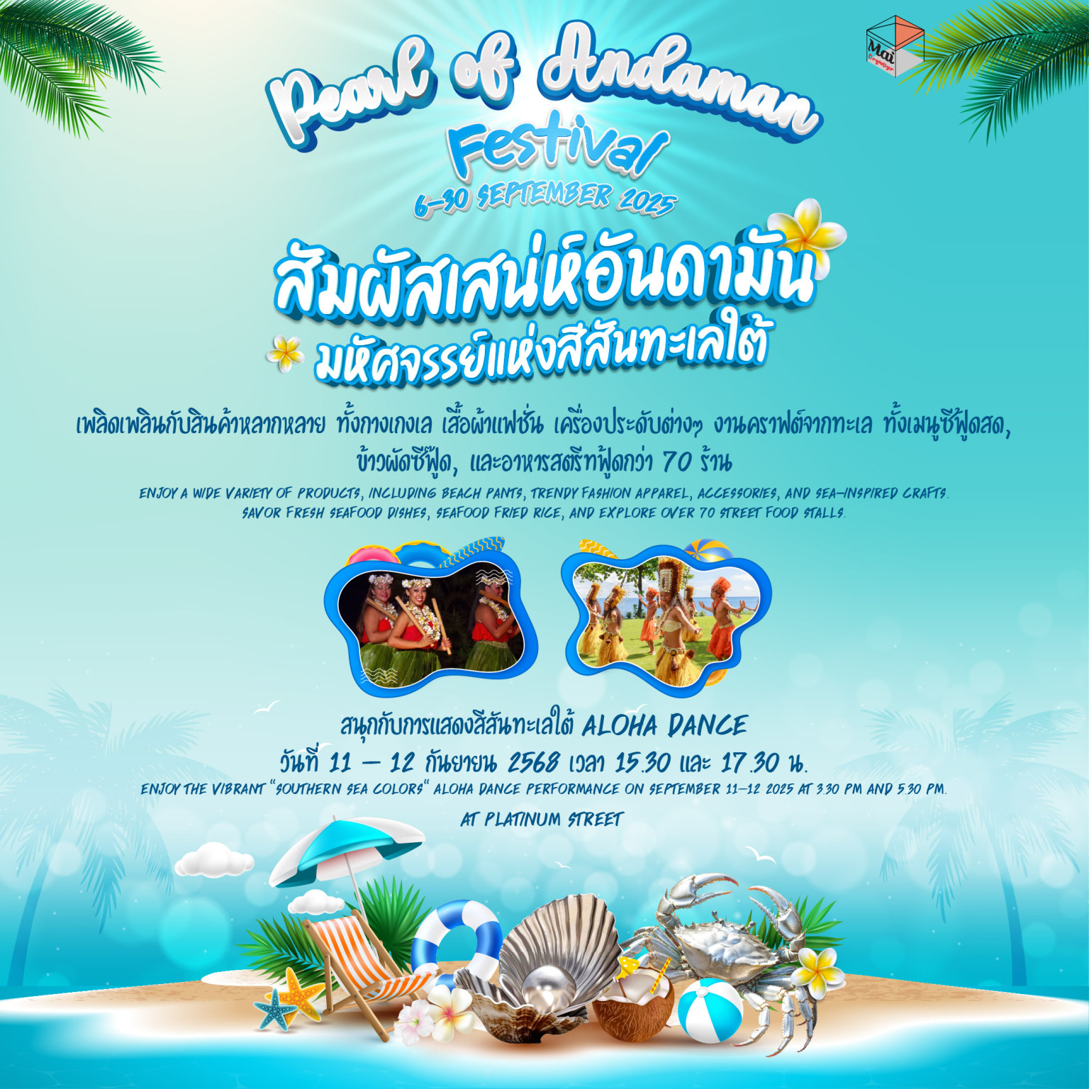 ศูนย์การค้าแพลทินัม ชวนช้อปชิลในงาน Pearl of Andaman Festival มหัศจรรย์แห่งสีสันทะเลใต้ เชิญสัมผัสเสน่ห์แห่งแดนใต้ อิ่มอร่อยกับเมนูซีฟู้ดรสจัดจ้าน อาทิ ข้าวผัดซีฟู้ด ปลาหมึกย่าง บาร์บีคิว และอาหารสตรีทฟู้ดมากมาย เพลิดเพลินกับสินค้า ครื่องประดับสุดเก๋ ของตกแต่งบ้าน เสื้อผ้าแฟชั่นสุดอินเทรนด์ มากกว่า 70 ร้านค้า ชมการจัดแสดงสุดตื่นตาตื่นใจ “ALOHA DANCE” สีสันทะเลใต้ ตั้งแต่วันนี้ ถึงวันที่ 30 กันยายน 2568 ณ ศูนย์การค้าแพลทินัม ติดตามรายละเอียดร้านค้าและโปรโมชั่นเพิ่มเติมได้ทาง Facebook : Platinum Fashion Mall แพลทินัม แฟชั่น มอลล์