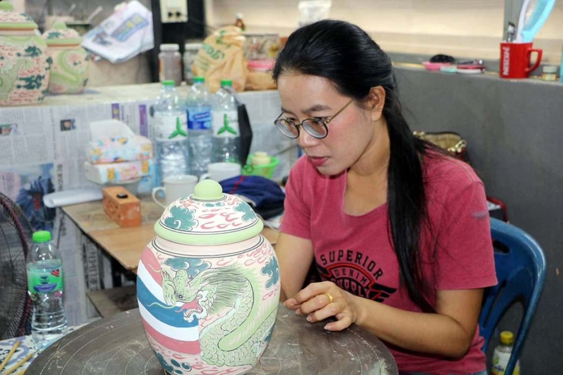 ล่าสุดทางเจ้าของโรงโอ่งได้มีไอเดียบรรเจิดการปั้นโอ่งเขียนลายเป็นรูปมังกรประกอบเป็นสีธงชาติขึ้น มีหลายขนาด ลักษณะมีฝาปิด และมีขาตั้งสีสันสวยงามสะดุดตานำมาตั้งโชว์ไว้ที่ด้านหน้าร้าน นักท่องเที่ยวหลายคนที่มาเลือกซื้อของฝาก ได้ให้ความสนใจและสอบถามถึงที่มาของการปั้นโอ่งลวดลายเป็นเอกลักษณ์เฉพาะนี้ ยังไม่เคยมีโรงโอ่งที่ไหนคิดทำมาก่อน ถือเป็นครั้งแรกของวงการปั้นเครื่องปั้นดินเผาที่มีไอเดียนี้เกิดขึ้น