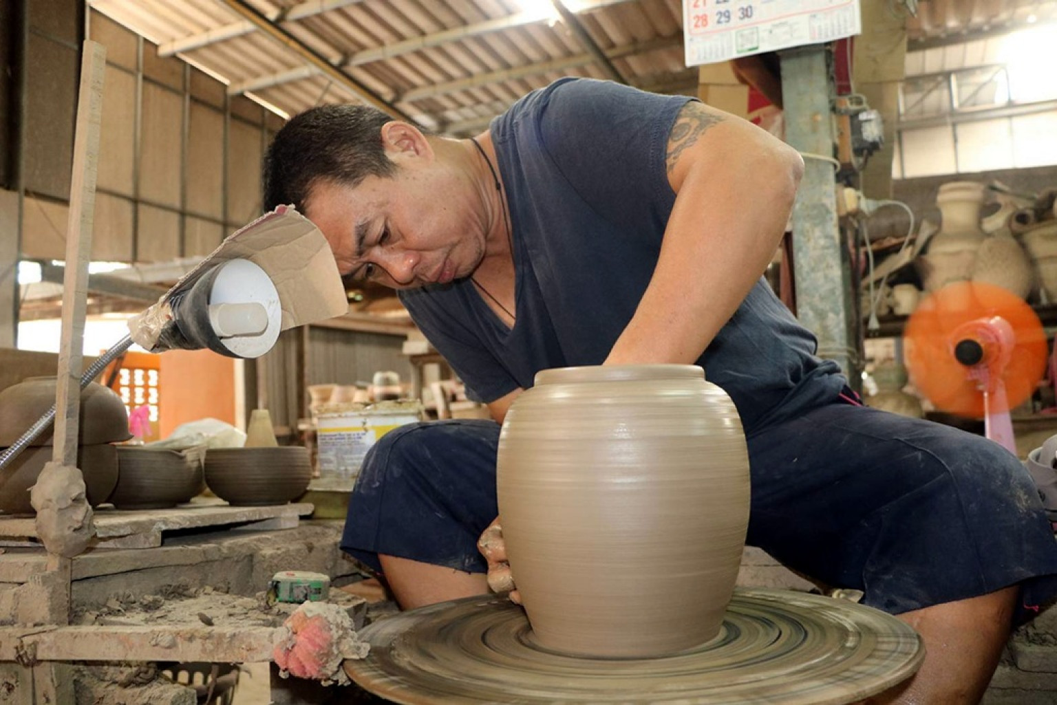 ส่วนขั้นตอนการปั้นโอ่งมังกรเริ่มจากตัดดินเป็นก้อนนำมาปั้นขึ้นรูปทรงตามขนาด เมื่อปั้นเสร็จแล้วให้นำไปวางผึ่งลมให้แห้ง ทิ้งไว้ประมาณ 1 คืน วันรุ่งขึ้นจึงนำมาเขียนลวดลายตามจินตนาการ ซึ่งต้องใช้มีความชำนาญ และความประณีต เสร็จแล้วจึงนำเข้าเตาเผาครั้งที่ 1 อุณหภูมิเผาประมาณ 900 องศาเซลเซียล จะเรียกการเผานี้ว่าการเผาดิบ จากนั้นจะนำโอ่งมาเขียนลาย และนำไปเผาครั้งที่ 2 เป็นการเผาเคลือบที่อุณหภูมิประมาณ 1,200 องศาเซลเซียส เผาประมาณ 1 วัน และปล่อยทิ้งให้เย็นอีก 1 วัน วันที่ 3 จึงนำออกมาจากเตาเผาได้