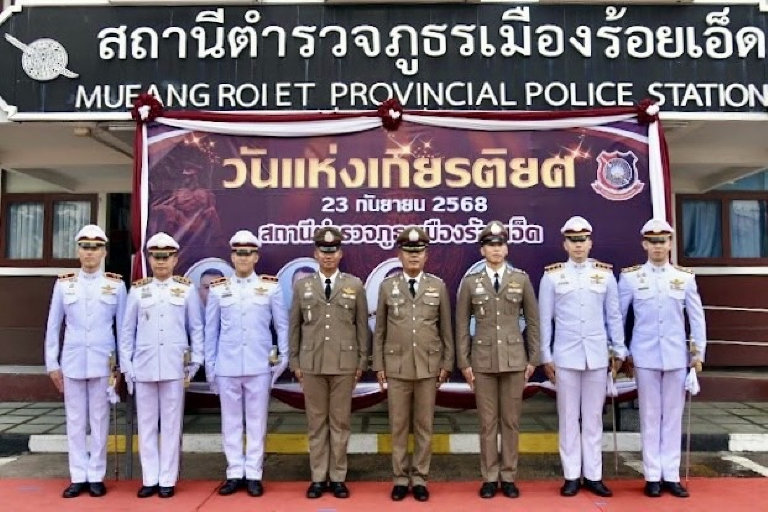 รอง ผกก.(สอบสวน) สภ.เมืองร้อยเอ็ด, พ.ต.ท.เนติวุธ สุดหนองบัว รอง ผกก.ป.สภ.เมืองร้อยเอ็ด, พ.ต.ท.สมโภชน์ แสวงแก้ว รอง ผกก.สส.ฯ, พ.ต.ท.จักรพันธ์ มากสี รอง ผกก.จร.สภ.เมืองร้อยเอ็ด และข้าราชการตำรวจ สภ.เมืองร้อยเอ็ด ร่วมกิจกรรมแสดงมุทิตาจิต แด่ข้าราชการตำรวจผู้ครบเกษียณอายุราชการ ประจำปีงบประมาณ 2568 ณ บริเวณลานหน้า สภ.เมืองร้อยเอ็ด