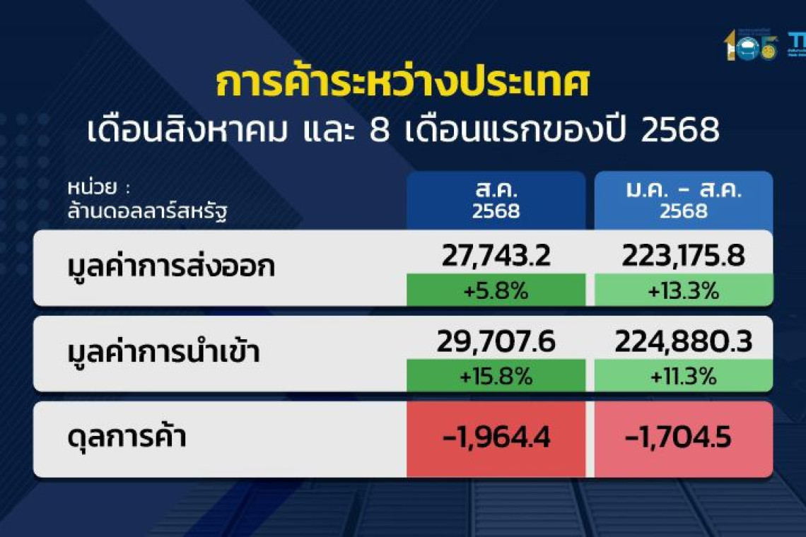 สำหรับภาพรวม 8 เดือนแรกของปีนี้ (ม.ค.–ส.ค. 2568) ไทยมีมูลค่าการส่งออก 223,175 ล้านดอลลาร์ ขยายตัว 13.3% ส่วนการนำเข้าอยู่ที่ 224,880 ล้านดอลลาร์ ขยายตัว 11.3% ทำให้ช่วงดังกล่าวไทยขาดดุลการค้า 1,704 ล้านดอลลาร์
