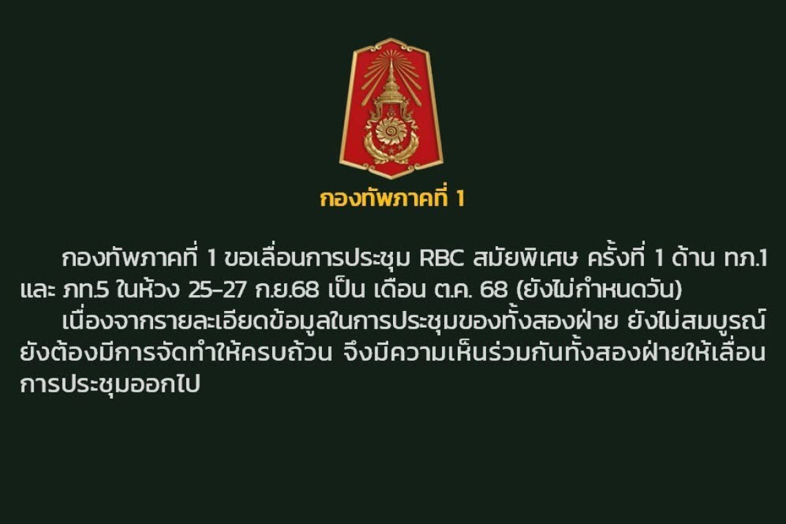 ด้าน พลตรี สุรวิชญ์ แดงจันทร์ เสนาธิการกองทัพภาคที่ 1 ในฐานะโฆษกกองทัพภาคที่ 1 ระบุถึงสาเหตุที่กองทัพภาคที่ 1 ขอเลื่อนการประชุมคณะกรรมการชายแดนส่วนภูมิภาค หรือ RBC สมัยพิเศษ ครั้งที่ 1 ระหว่างกองทัพภาคที่ 1 และภูมิภาคทหารที่ 5 ของกัมพูชา ในช่วงวันที่ 25-27 กันยายน 2568 เป็นเดือนตุลาคม 2568 ว่า สืบเนื่องจากข้อมูลของสองฝ่ายยังไม่มีความคืบหน้าเท่าที่ควร ทั้งเรื่องสแกมเมอร์ ทุ่นระเบิด เนื่องจากแต่ละหน่วยงานที่มีการประสานงานกันอยู่น้้น ยังมีการปรับรายละเอียด และมีการเลื่อนกันไปเลื่อนกันมา จึงยังไม่มีข้อมูลความคืบหน้ามานำเสนอมากนัก