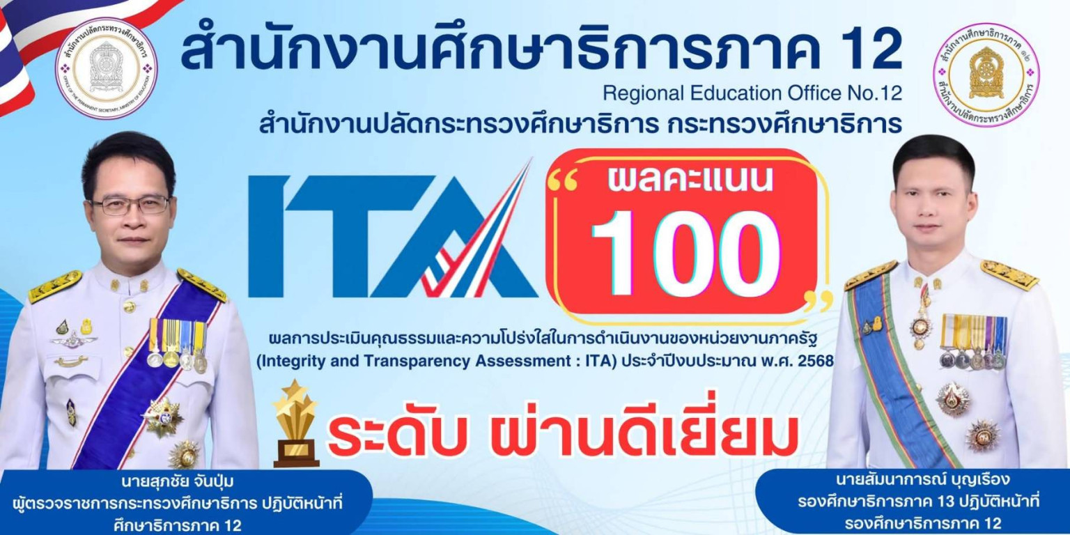 วันที่ 24 ก.ย.68 ที่สำนักงานศึกษาธิการภาค 12 นายสุขชัย จับปุ่ม ผู้ตรวจการกระทรวงศึกษาธิการ ปฏิบัติหน้าที่ศึกษาธิการ ภาค 12 ประกาศ ผลการประเมินคุณธรรมและความโปร่งใสในการดำเนินงานของหน่วยงานภาครัฐ หรือ การประเมิน ITA ซึ่งย่อมาจาก Integrity and Transparency Assessment ให้แก่ นายสัมมนาการณ์ บุญเรือง รองศึกษาธิการ ภาค 13 ปฏิบัติหน้าที่รองศึกษาธิการภาค 12 ได้รับการประเมิน คุณธรรมและความโปร่งใส ในการดำเนินงานของหน่วยงานภาครัฐ 100%