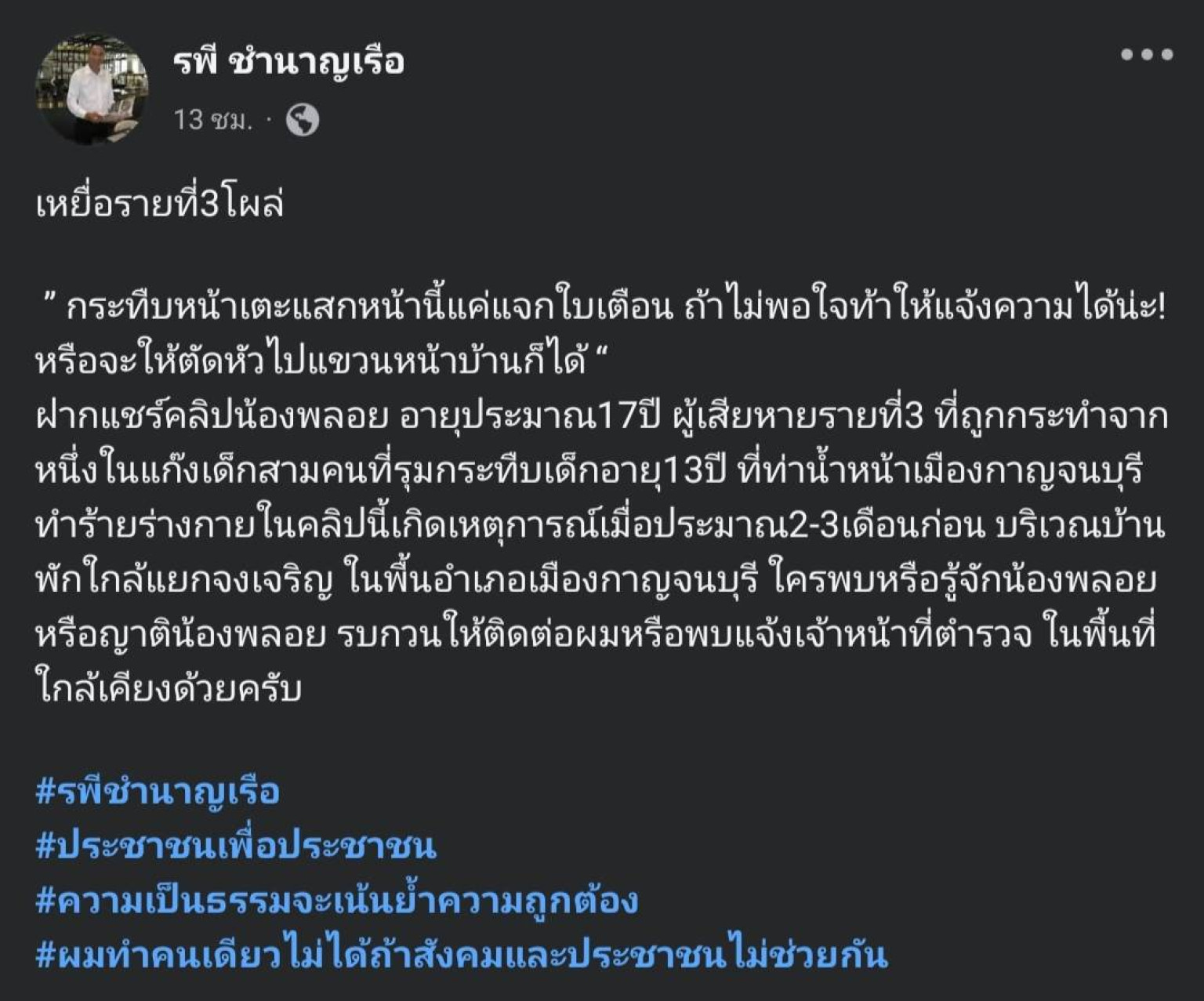 ผุ้สื่อข่าวแจ้งว่า จากกรณีแก๊งเด็กหญิง 3 คน รุมทำร้ายเด็กหญิงวัย 13 ปี บริเวณท่าน้ำกลางเมืองกาญจนบุรี ล่าสุดมีเหยื่อรายใหม่โผล่เพิ่มเป็นรายที่ 3 โดยมีการเผยแพร่คลิปการทำร้ายร่างกาย “น้องพลอย”อายุประมาณ 17 ปี ถูกหนึ่งในแก๊งเดียวกันใช้เท้ากระทืบหน้าและเตะแสกหน้า พร้อมพูดท้าทายว่า “แค่แจกใบเตือน ถ้าไม่พอใจให้ไปแจ้งความ หรือจะให้ตัดหัวไปแขวนหน้าบ้านก็ได้”