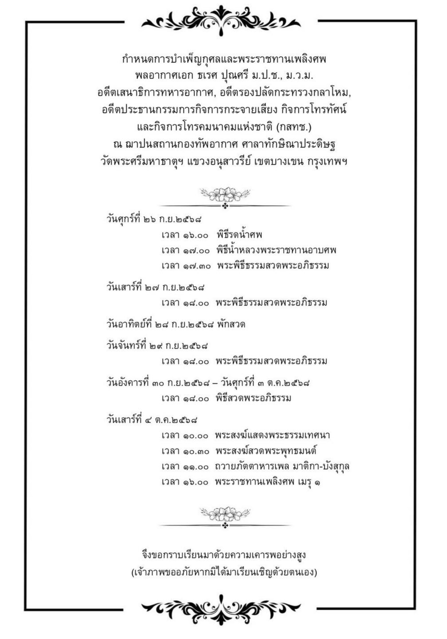 สำหรับ กำหนดการบำเพ็ญกุศลและพระราชทานเพลิงศพ พล.อ.อ.ธเรศ ปุณศรี จัดขึ้น ณ ฌาปนสถานกองทัพอากาศ ศาลาทักษิณาประดิษฐ์ วัดพระศรีมหาธาตุฯ แขวงอนุสาวรีย์ เขตบางเขน กรุงเทพฯ