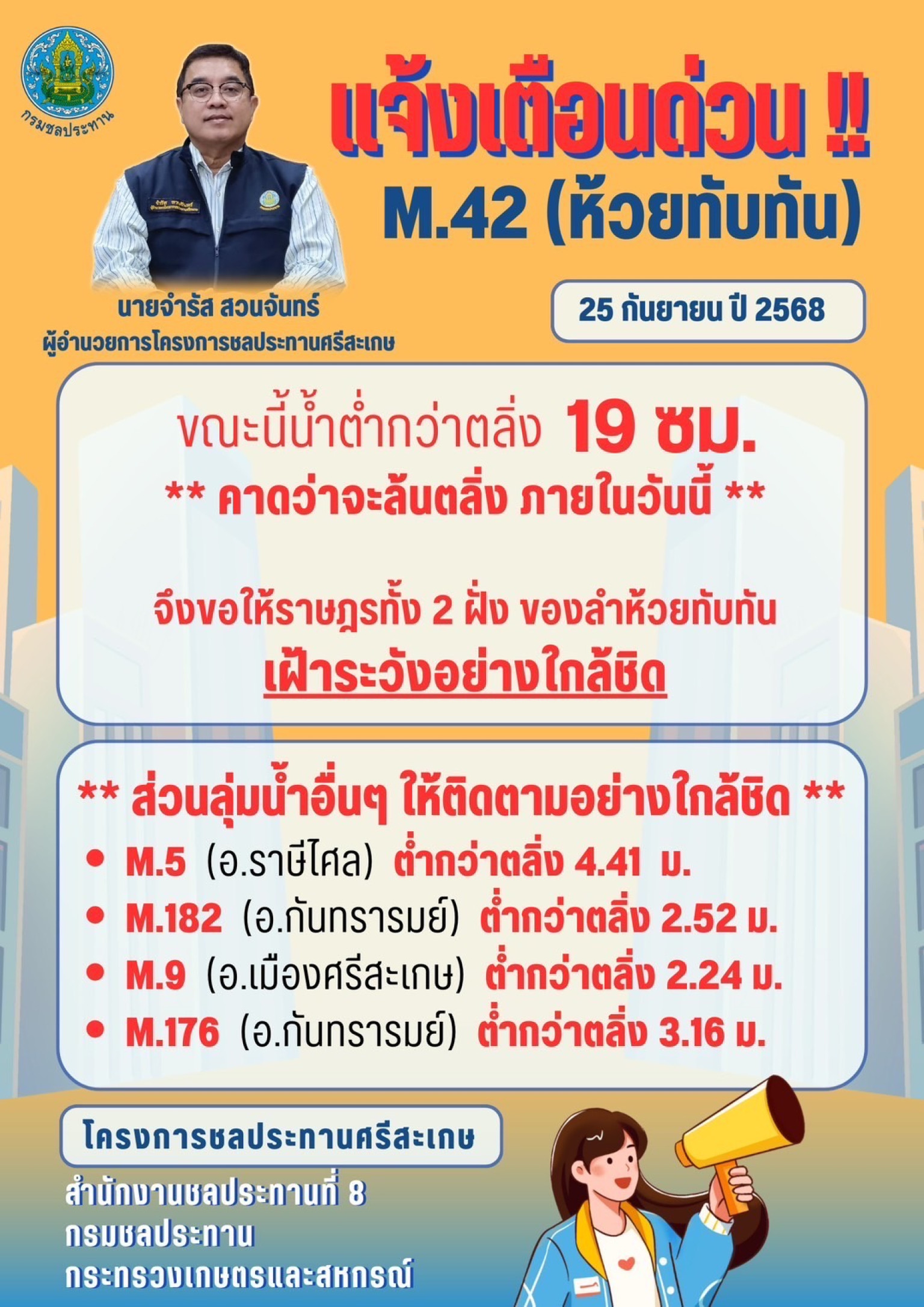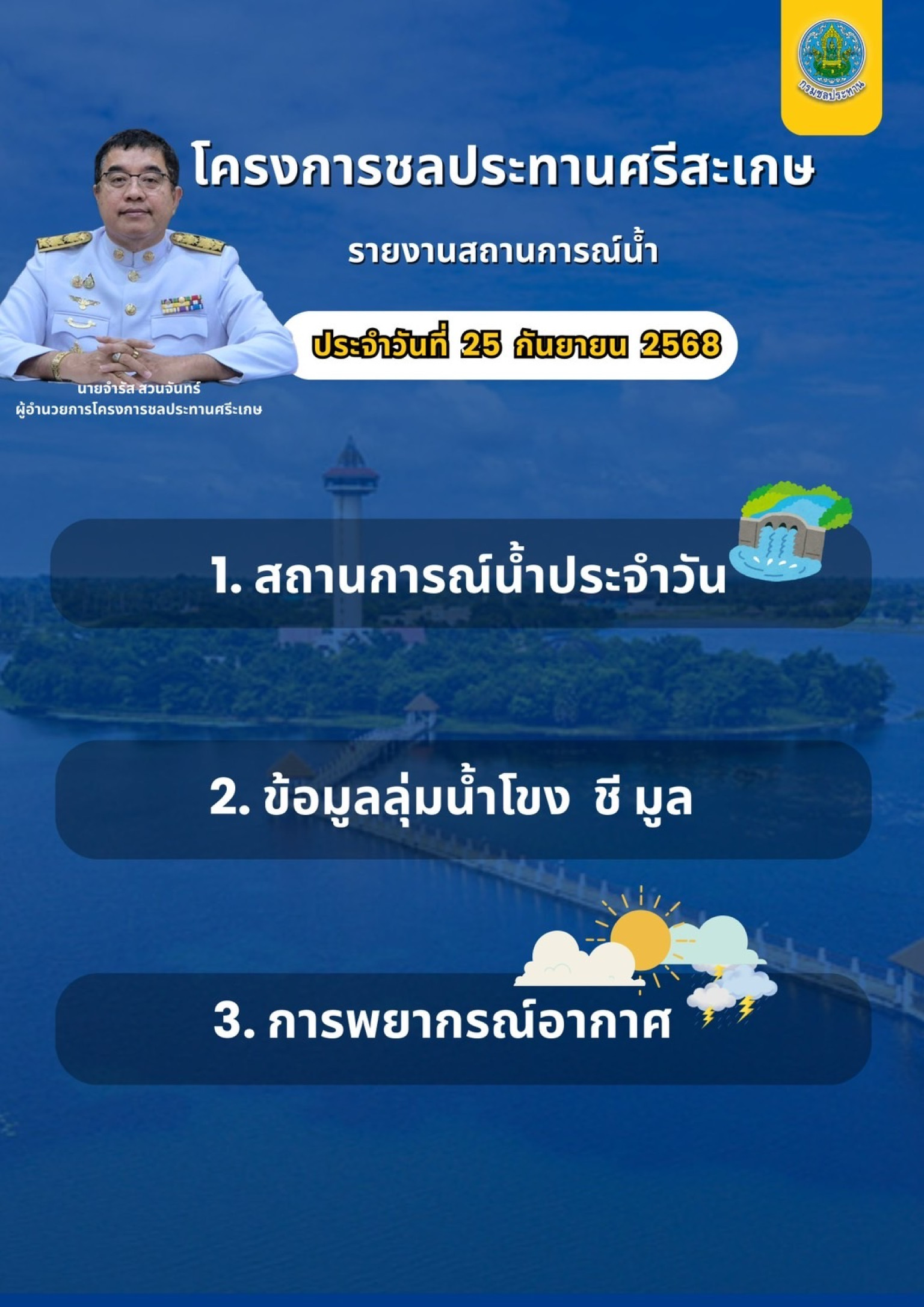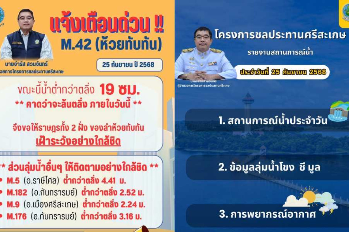 ผู้สื่อข่าว ได้สอบถามเรื่องนี้ จาก นายจำรัส สวนจันทร์ ผอ.โครงการชลประทานศรีสะเกษ ซึ่งได้ข้อเท็จจริง ว่า 3 ลุ่มน้ำใน จ.ศรีสะเกษ ที่ต้องเฝ้าระวัง ในช่วงระยะนี้ ได้แก่ ลุ่มน้ำห้วยทับทัน ซึ่งต้นน้ำไหลมาจาก จ.สุรินทร์ โดยคาดว่าหากวันที่ 26ก.ย. 68 ฝนตกหนักตามที่กรมอุตุฯรายงานอาจ จะล้นตลิ่ง รวมถึงลุ่มน้ำอื่นๆเช่นกัน เนื่องจากพื้นที่ตามแนวชายแดนไทย-กัมพูชา เป็นพื้นที่ภูเขา เทือกเขาพนมดงรัก ซึ่งเป็นแหล่งต้นน้ำ มีความชุ่มชื้นสูง และมีความลาดชัน ของพื้นที่มาก ความเร็วกระแสน้ำ จึงมีความรุนแรงในบางพื้นที่ จึงให้เฝ้าระวังพื้นที่ลุ่มต่ำและบริเวณถนนที่ตัดผ่านทางน้ำ และล่าสุด ได้เฝ้าระวังพื้นที่ด้านท้ายอ่างเก็บน้ำ ตามแนวชายแดนไทย- กัมพูชา ซึ่ง ปัจจุบัน เกิน 100% และน้ำ กำลังระบายผ่านสปิลเวย์ โดยที่ผ่านมา ทางโครงการชลประทานศรีสะเกษ ได้มีการระบายน้ำอย่างต่อเนื่อง. โดนโครงการ ชป.ศรีสะเกษ ได้รายงานสถานการณ์น้ำเสนอ ต่อ นายอนุพงศ์ สุขสมนิตย์ ผู้ว่าราชการจังหวัดศรีสะเกษว่า M7. อุบลราชธานีระดับน้ำเกิน ระดับตลิ่ง 12 ซม. (ฝั่ง อ.วารินชำราบ) แต่ยังต่ำกว่าตลิ่ง 88 ซม.(ฝั่ง อ. เมือง)