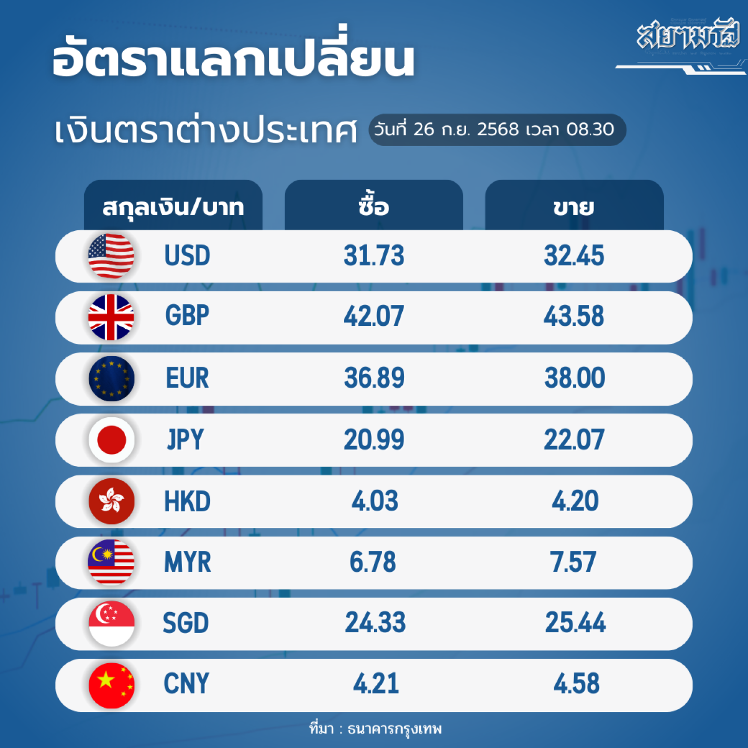 วันที่ 26 ก.ย.68 ผู้สื่อข่าวรายงานอัตราแลกเปลี่ยนเงินตราต่างประเทศ ประจำวันที่ 26 ก.ย.68 ว่า อัตราแลกเปลี่ยนเงินบาทเป็นสกุลเงินตราต่างๆ ตามเวลา 08.30 น. (ตามตารางประกอบข้างล่าง) โดยเงินดอลลาร์สหรัฐรับซื้อ 31.73 บาท ต่อดอลลาร์สหรัฐ ขายออก 32.45 บาทต่อดอลลาร์สหรัฐ