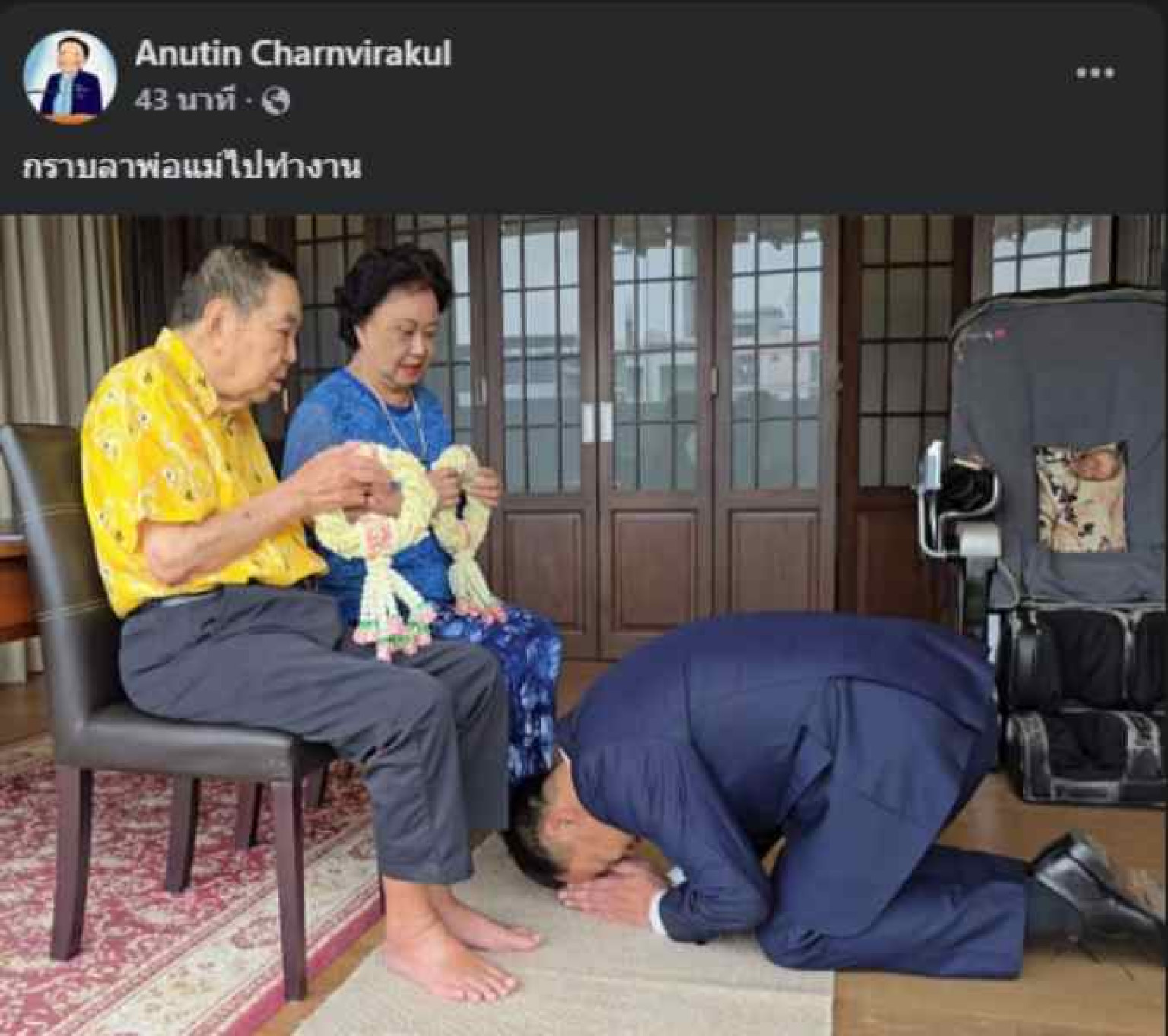 26 กันยายน 2568 09:25 น. สยามรัฐออนไลน์ การเมือง วันที่ 26 ก.ย.68 นายอนุทิน ชินวัตร นายกรัฐมนตรี โพสต์ภาพ เฟซบุ๊ก Anutin Charnvirakul พร้อมระบุข้อความว่า... กราบลาพ่อแม่ไปทำงาน