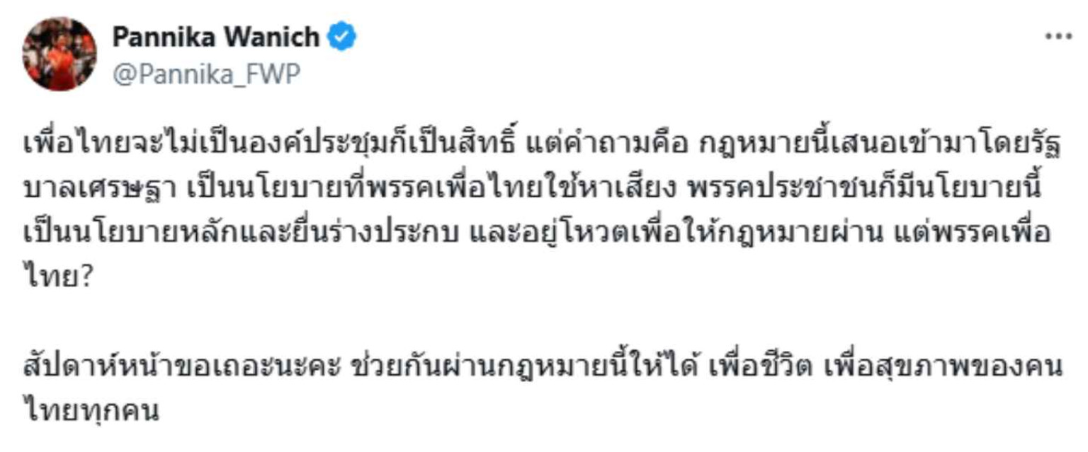 เพื่อไทยจะไม่เป็นองค์ประชุมก็เป็นสิทธิ์ แต่คำถามคือ กฎหมายนี้เสนอเข้ามาโดยรัฐบาลเศรษฐา เป็นนโยบายที่พรรคเพื่อไทยใช้หาเสียง พรรคประชาชนก็มีนโยบายนี้เป็นนโยบายหลักและยื่นร่างประกบ และอยู่โหวตเพื่อให้กฎหมายผ่าน แต่พรรคเพื่อไทย?