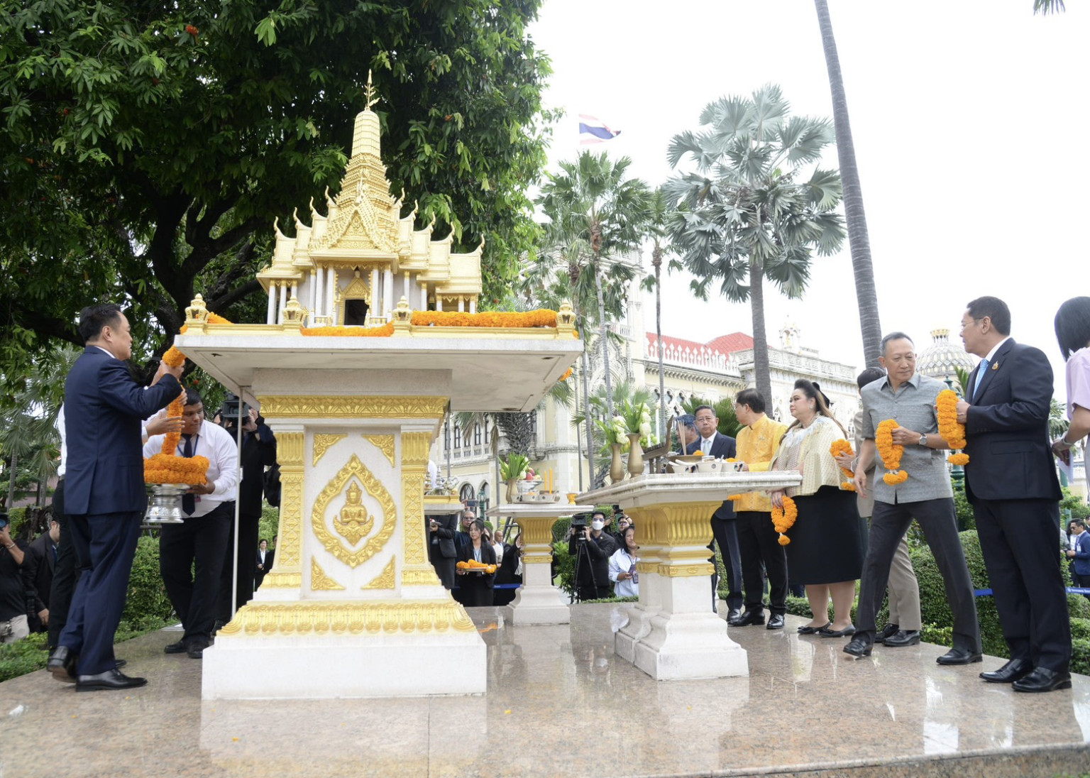 จากนั้นเวลา 09.00 น. นายกรัฐมนตรี และรัฐมนตรี ได้ลงจากตึกไทยคู่ฟ้า เพื่อมาสักการะสิ่งศักดิ์สิทธิ์ประจำทำเนียบรัฐบาล ศาลพระภูมิเจ้าที่ ศาลตายาย เพื่อความเป็นสิริมงคล โดยมี นายภราดร ปริศนานันทกุล รัฐมนตรีประจำสำนักงานนายกรัฐมนตรี , นายนภินทร ศรีสรรพางค์ รัฐมนตรีประจำสำนักนายกรัฐมนตรี , นางศุภมาส อิศรภักดี รัฐมนตรีประจำสำนักนายกรัฐมนตรี , นายสันติ ปิยะทัต รัฐมนตรีประจำสำนักนายกรัฐมนตรี , นายวรภัค ธันยาวงษ์ รัฐมนตรีช่วยว่าการกระทรวงการคลัง และพลโท อดุลย์ บุญธรรมเจริญ รัฐมนตรีช่วยว่าการกระทรวงกลาโหม รวมถึงสส.พรรคภูมิใจไทย และคณะทำงาน ร่วมติดตามมาด้วย