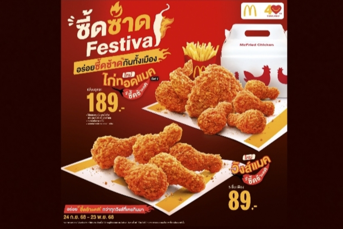 แมคโดนัลด์ เปิดตัวแคมเปญใหม่ ‘ซี้ดซ้าด Festival’ อร่อยซี้ดซ้าดกันทั้งเมือง ท้าให้ลองเมนูใหม่ที่สายแซ่บ สายซี้ด พลาดไม่ได้ กับ 2 เมนูใหม่ ‘วิงส์แมคซี้ดซ้าด’ และ ‘ไก่ทอดแมคซี้ดซ้าด’ เสิร์ฟความอร่อย กรอบนอก ชุ่มฉ่ำใน พร้อมความอร่อยกับผงซี้ดซ้าด ที่เผ็ดซี้ดสะใจถึงรสพริก มะนาว และข้าวคั่ว ยืนยันความอร่อย จากผลสำรวจผู้บริโภค 284 คน กว่า 90% คอนเฟิร์มว่า วิงส์แมคซี้ดซ้าดและไก่ทอดแมคซี้ดซ้าด อร่อยกว่าไก่ทอดที่เคยกินมา