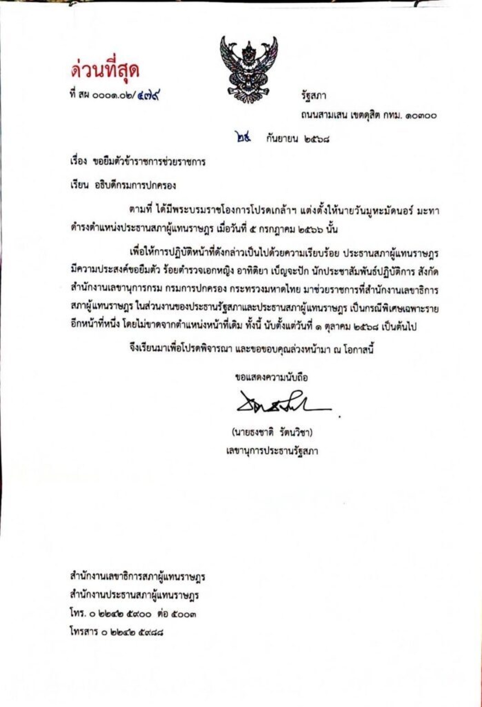 โดยการขอยืมตัวครั้งนี้เป็นกรณีพิเศษเฉพาะราย เพื่อสนับสนุนงานในส่วนของประธานรัฐสภาและประธานสภาผู้แทนราษฎร โดยไม่ขาดจากตำแหน่งหน้าที่เดิม ทั้งนี้จะมีผลตั้งแต่วันที่ 1 ตุลาคม 2568 เป็นต้นไป จึงเรียนมาเพื่อโปรดพิจารณาและขอขอบคุณล่วงหน้า