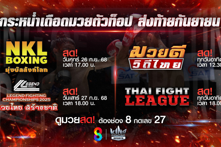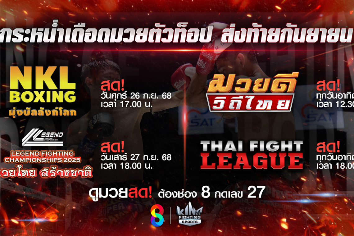 ดังนั้นห้ามพลาดชม 4 รายการมวยไทยสุดสัปดาห์ การันตีความมันส์ที่สุดระดับประเทศ ใน รายการ NKL Boxing มุ่งบัลลังก์โลก ในวันศุกร์ที่ 26 กันยายน เวลา 17.00 น. ต่อเนื่องในวันเสาร์ที่ 27 กันยายน ในอีเวนต์ยักษ์ รายการ LEGEND FIGHTING CHAMPIONSHIPS 2025 เวลา 18.00 น. และ 2 รายการสุดมันส์ปิดท้าย ในวันอาทิตย์ที่ 28 กันยายน กับรายการ มวยดีวิถีไทย เวลา 12.30 น. และ รายการ THAI FIGHT LEAGUE เวลา 18.00 น. ทางช่อง 8 กดเลข 27 ที่มีรายการมวยไทยมากที่สุด!