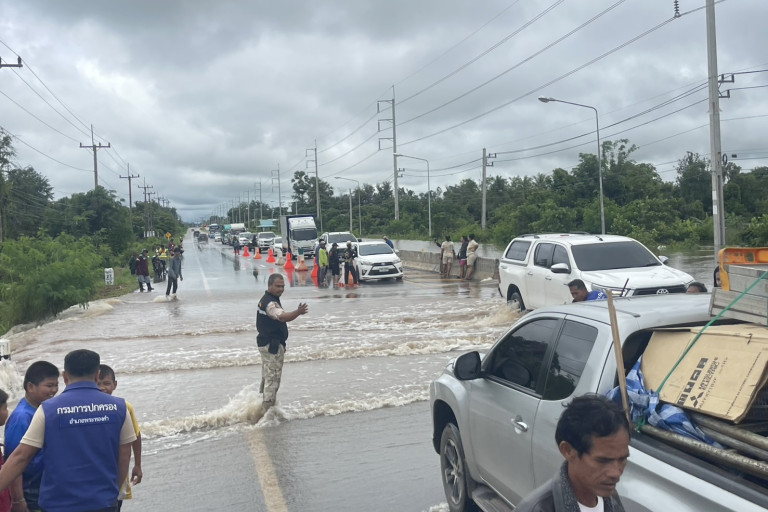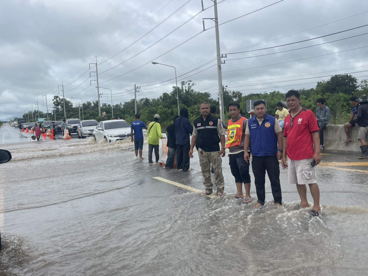 เมื่อเวลา 12.00 น. วันที่ 27 ก.ย.68 นายอำนวยศิลป์ มานะงาน นายอำเภอพระทองคำ จ.นครราชสีมา พร้อมหัวหน้าส่วนงานที่เกี่ยวข้อง ผู้บริหารองค์กรปกครองส่วนท้องถิ่น (อปท.) และผู้นำชุมชน สนธิกำลังอำนวยความสะดวกด้านการจราจร โดยติดสัญญาณไฟแจ้งเตือนและวางแบริเออร์สะท้อนแสงให้ผู้ใช้รถใช้ถนนระมัดระวังการใช้เส้นทางหลวงหมายเลข (ทล.) 205 ถ.สุรนารายณ์ ช่วงผ่านบ้านมาบกราด หมู่ 6 ต.มาบกราด อ.พระทองคำ ล่าสุดสถานการณ์ค่อนข้างทรงตัว ช่วงหลักกิโลเมตรที่ 180 ระดับน้ำสูงสุด 60-70 เซนติเมตร ระยะทางยาวกว่า 400 เมตร ส่งผลกระทบต่อการสัญจร จึงได้เปิดช่องทางพิเศษให้รถสวนกัน ฝั่งขาออก จ.นครราชสีมา
