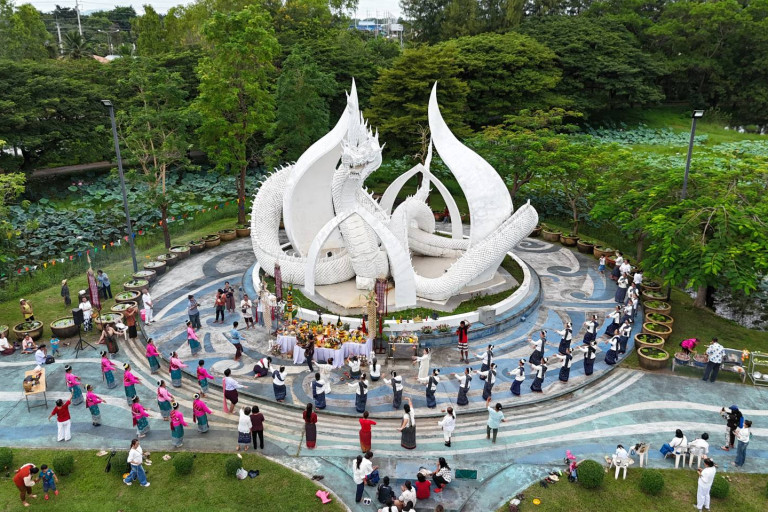 น.ส.ทัศนีย์ จันทร์ภูถิ่นผู้จัดการอุทยานบัวฯ กล่าวว่า ตั้งแต่ก่อสร้างองค์ปู่เสร็จก็มีพิธีบวงสรวงครั้งเดียว จึงหารือกับชุมชนและได้ข้อสรุปว่าจะต้องทำพิธีบวงสรวงขึ้น ทางมหาวิทยาลัยก็คิดว่าต่อไปนี้จะทำทุกปี ด้าน ดร.อานนท์ เอื้อตระกูล สถาบันอานนท์ไบโอเทค อุทยานบัวเฉลิมพระเกียรติ บอกว่าตนมีลูกศิษย์มากมาย ก็คุยกันว่าทำไมพญานาคที่ นครพนม ผู้คนนักท่องเที่ยวถึงไปสักการะได้ ดังนั่นจึงคิดกันว่าจะต้องจัดพิธีบวงสรวงก่อนงานแห่ปราสาทผึ้งและงานไหลเรือไฟที่นครพนม เพราะก่อนจะไปนครพนม พญานาคเผือกเป็นทางผ่านนักท่องเที่ยวได้มาชมอุทยานบัวและถือโอกามาสักการะพญานาคเผือกด้วย เป็นอีกจุดที่สามารถถ่ายภาพได้ นักท่องเที่ยวนิยมมาชมความสวยงามและขอพรกัน ซึ่งถือว่าเป็นแลนด์มาร์กของอุทยานบัวเฉลิมพระเกียรติแห่งนี้เลย
