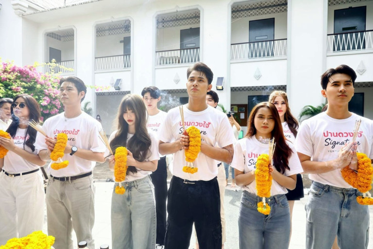 ถือฤกษ์ดีเสาร์ที่ 27 กันยายน 2568 เวลา 09.39 น. นักแสดงจากซีรีส์แนวตั้ง “ปานดวงใจ Signature” นำทีมโดยนางเอกน้องใหม่ เกลิน-ธัญรดี ชาญชนินท์กุล ควงคู่มากับพระเอกเคมีใหม่ เล้ง-ณัฐพล นิลดอนหวาย ที่พักจากงานซีรีส์วายมาสวมบทพระเอกในซีรีส์แนวตั้งแนวโรแมนติกดราม่า เข้าร่วมพิธีไหว้ขอพรองค์พระพิฆเนศร์ เอาฤกษ์เบิกชัยในการเปิดกล้องซีรีส์เรื่องนี้ ณ ลานพระพิฆเนศร์ สถาบันบัณฑิตพัฒนศิลป์ วังหน้า กรุงเทพฯ