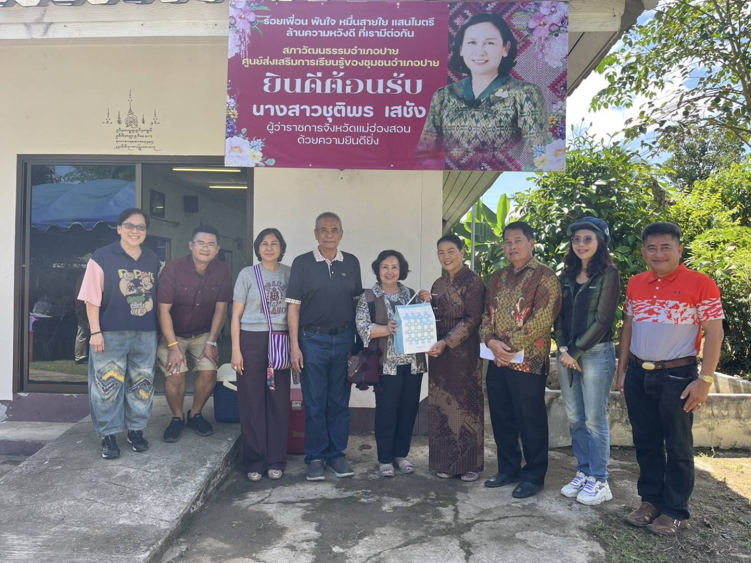 เมื่อวันที่ 27 กันยายน 2568 นางอาภรณ์ แสงโชติ หรือ ป้าแหลง ประธานสภาวัฒนธรรมอำเภอปาย จ.แม่ฮ่องสอน พร้อมด้วยนายเติมศักดิ์ แสงโชติ สามี ให้การต้อนรับ ดร.ชุติพร เสชัง ผู้ว่าราชการจังหวัดแม่ฮ่องสอนคนใหม่ ที่บ้านของป้าแหลง โดยมีนายอุดมศักดิ์ ขาวหนูนา รองผู้ว่าราชการจังหวัดแม่ฮ่องสอน พร้อมด้วย นายผะอบ บินสะอาด ปลัดจังหวัดแม่ฮ่องสอน และนายณพล พาหุมัณโต นายอำเภอปาย นำหัวหน้าส่วนราชการ นายกกิ่งกาชาดอำเภอปาย สภาวัฒนธรรมอำเภอปาย อปท. ในพื้นที่ กำนัน ผู้ใหญ่บ้าน ร่วมให้การต้อนรับและรับประทานอาหารร่วมกัน โดยมีผู้ร่วมงาน 120 คน