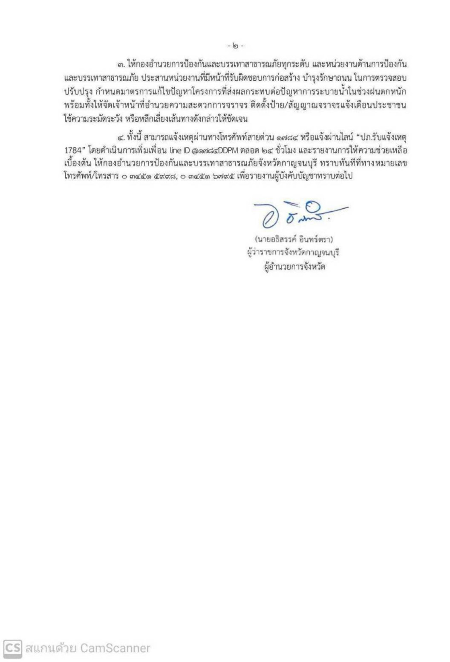 ทั้งนี้ หากประชาชนพบเหตุฉุกเฉิน สามารถแจ้งเหตุได้ที่ สายด่วน 1784 หรือทาง ไลน์ ปภ.รับแจ้งเหตุ (@1784DDDPM) ได้ตลอด 24 ชั่วโมง รวมทั้งให้รายงานผลการช่วยเหลือไปยัง กองอำนวยการป้องกันและบรรเทาสาธารณภัยจังหวัดกาญจนบุรี โทรศัพท์/โทรสาร 034-515998, 034-516795 เพื่อสรุปรายงานผู้บังคับบัญชาต่อไป