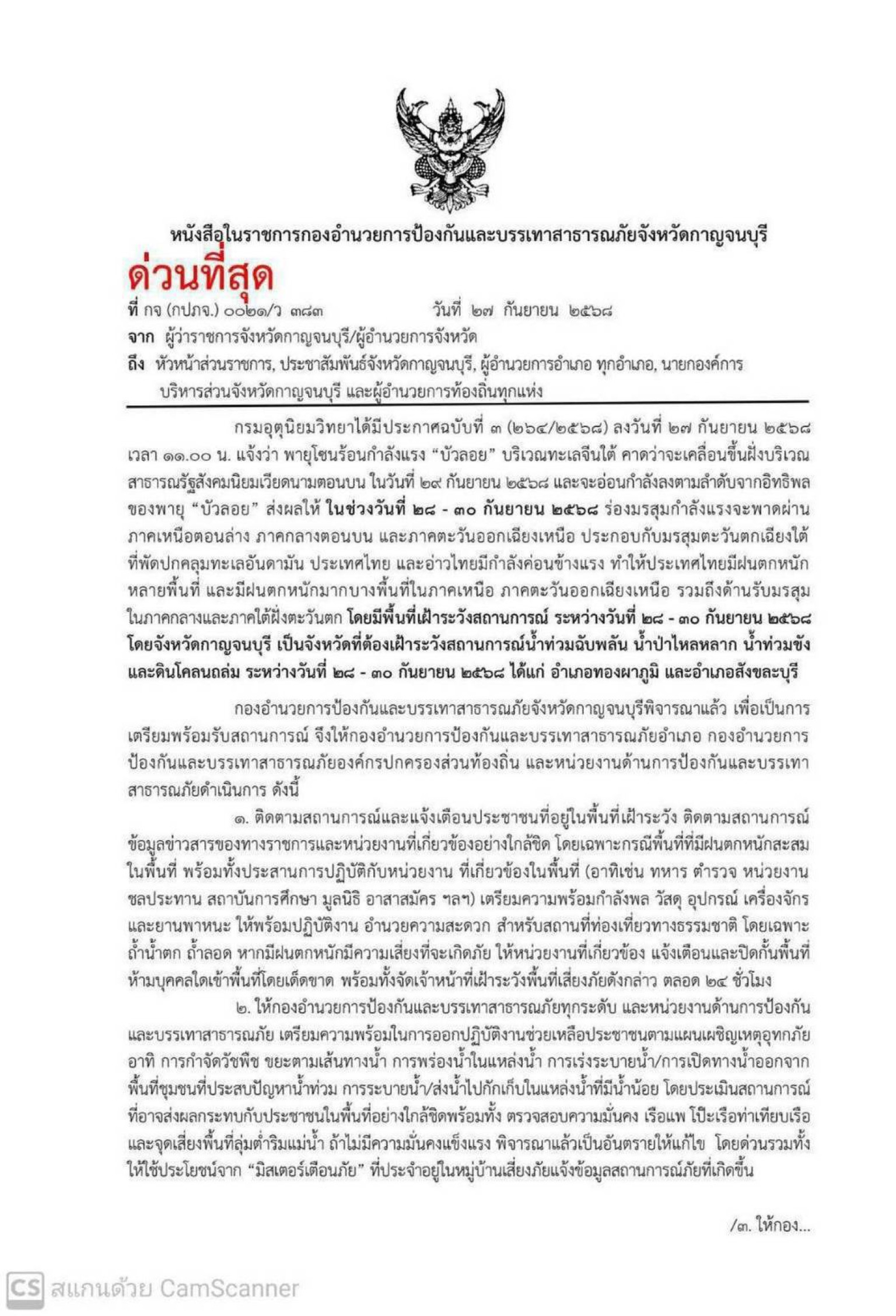 วันที่ 28 ก.ย.68 ผู้ว่าราชการจังหวัดกาญจนบุรี ออกคำสั่งด่วนให้ทุกหน่วยงานเตรียมพร้อมรับมือสถานการณ์น้ำท่วมฉับพลัน น้ำป่าไหลหลาก และดินโคลนถล่ม หลังกรมอุตุนิยมวิทยาแจ้งเตือนอิทธิพลพายุโซนร้อน “บัวลอย” ที่จะส่งผลกระทบในพื้นที่จังหวัดกาญจนบุรี ระหว่างวันที่ 28–30 กันยายนนี้