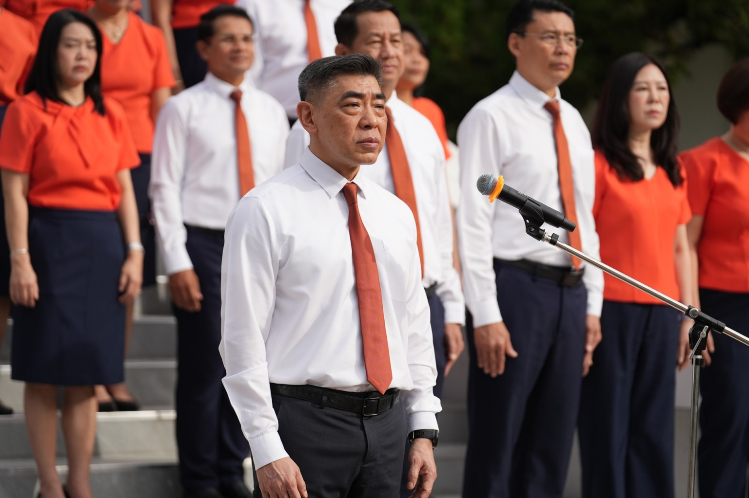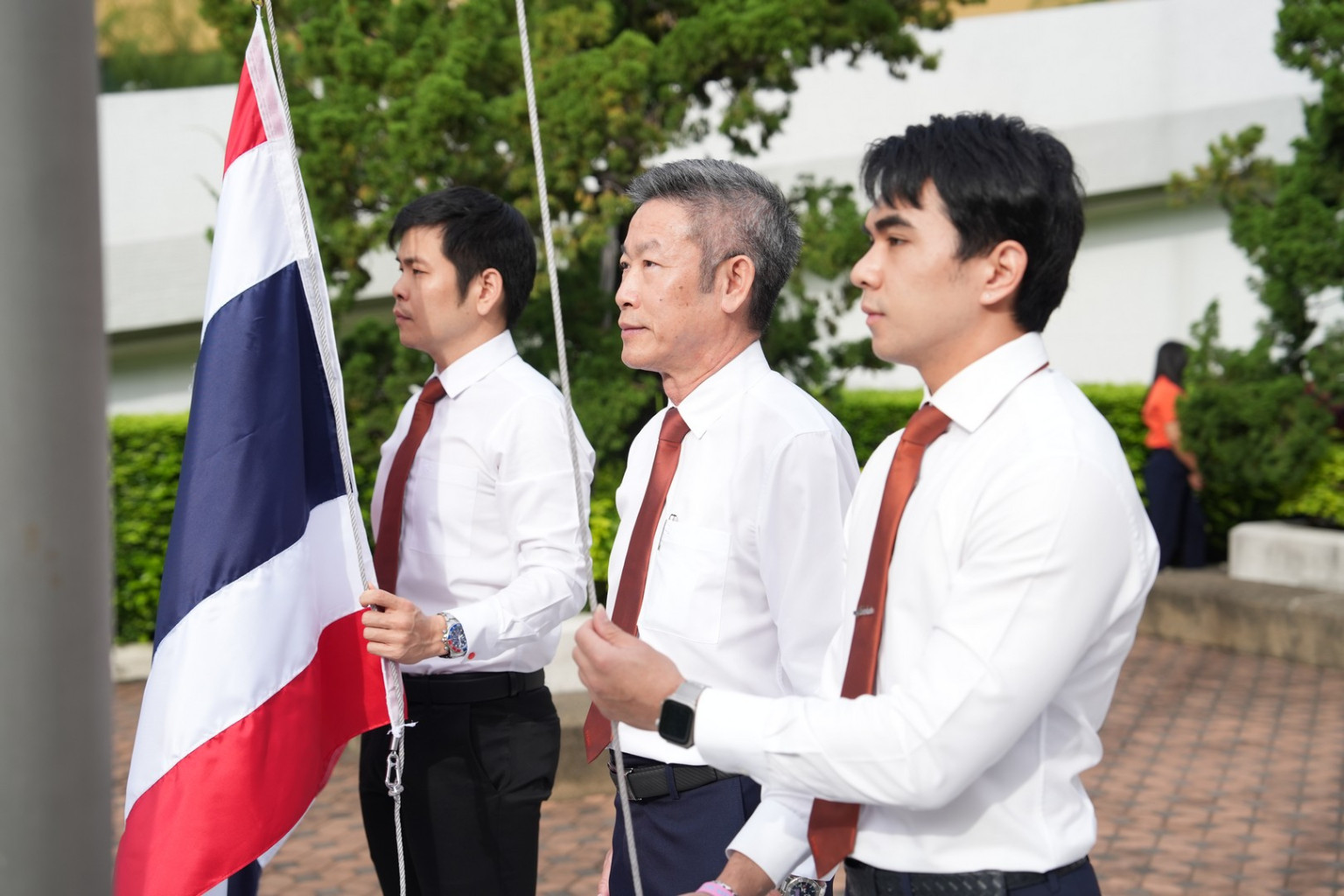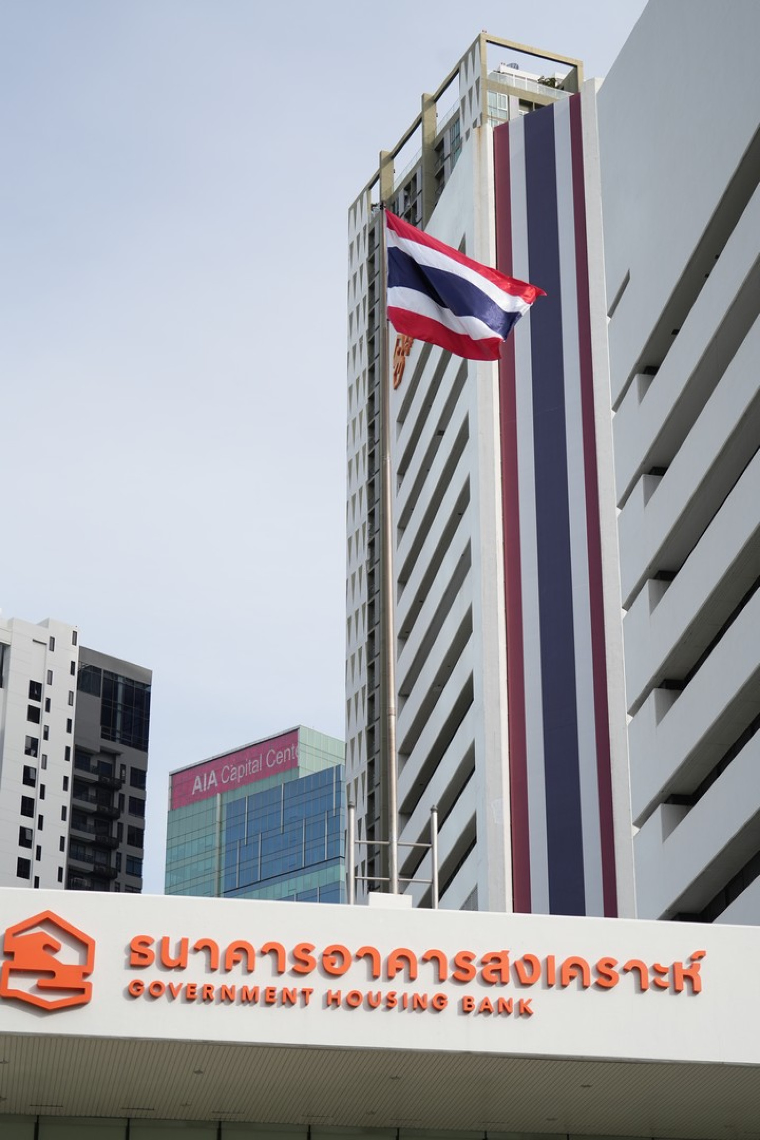 ถัดมาด้านนอกทั้งด้านบนและล่างเป็นสีขาวและสีแดงตามลำดับ แถบสีน้ำเงินมีขนาดใหญ่กว่าแถบสีอื่นเป็น 2 เท่า ส่วนความหมายของธงไตรรงค์นั้น พระบาทสมเด็จพระมงกุฎเกล้าเจ้าอยู่หัวทรงกำหนดความหมายของสีธงชาติไว้ว่า สีแดง หมายถึง ชาติ คือประชาชน สีขาว หมายถึง ศาสนา และสีน้ำเงิน หมายถึง พระมหากษัตริย์ ในการนี้ กรรมการผู้จัดการมอบธงชาติไทยผืนใหม่สำหรับใช้ในการเคารพธงชาติประจำธนาคารอาคารสงเคราะห์ โดยประดับ ณ เสาธงชาติ หน้าอาคาร 1 และในเวลา 8 นาฬิกาตรง กรรมการผู้จัดการ พร้อมด้วยผู้บริหารระดับสูง ผู้บริหารและผู้ปฏิบัติงานธนาคาร ได้ร่วมกันเคารพธงชาติและร้องเพลงชาติไทยด้วยความภาคภูมิใจ ทั้งนี้ กิจกรรมดังกล่าวจัดขึ้น ณ บริเวณลานน้ำพุ ธนาคารอาคารสงเคราะห์ สำนักงานใหญ่ เมื่อวันที่ 29 กันยายน 2568