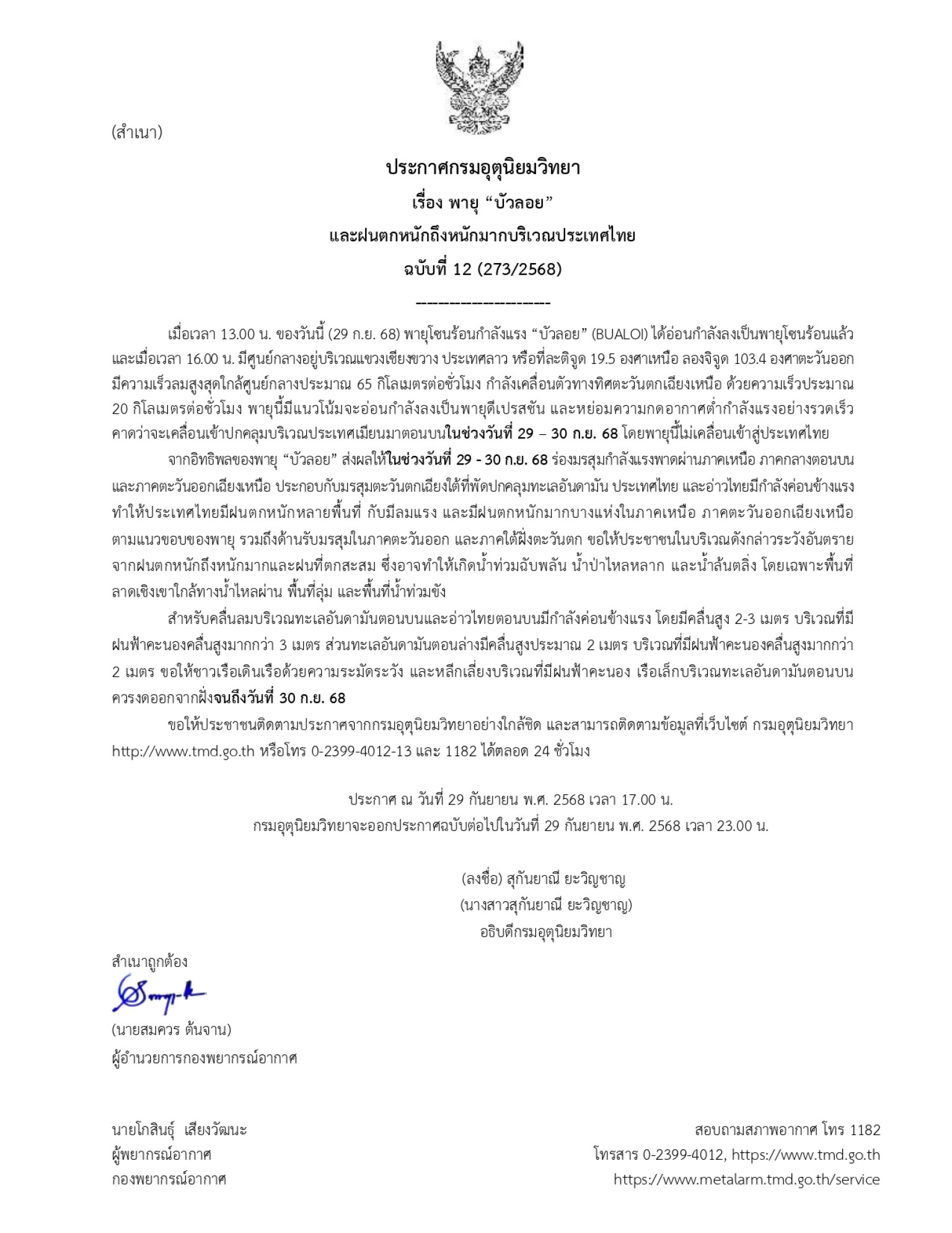 กรมอุตุนิยมวิทยา ออกประกาศฉบับที่ 12 (273/2568) เรื่อง พายุ “บัวลอย” และฝนตกหนักถึงหนักมากบริเวณประเทศไทย ระบุว่า เมื่อเวลา 13.00 น. ของวันนี้ (29 ก.ย. 68) พายุโซนร้อนกำลังแรง “บัวลอย” (BUALOI) ได้อ่อนกำลังลงเป็นพายุโซนร้อนแล้ว และเมื่อเวลา 16.00 น. มีศูนย์กลางอยู่บริเวณแขวงเชียงขวาง ประเทศลาว หรือที่ละติจูด 19.5 องศาเหนือ ลองจิจูด 103.4 องศาตะวันออก มีความเร็วลมสูงสุดใกล้ศูนย์กลางประมาณ 65 กิโลเมตรต่อชั่วโมง กำลังเคลื่อนตัวทางทิศตะวันตกเฉียงเหนือ ด้วยความเร็วประมาณ 20 กิโลเมตรต่อชั่วโมง พายุนี้มีแนวโน้มจะอ่อนกำลังลงเป็นพายุดีเปรสชัน และหย่อมความกดอากาศต่ำกำลังแรงอย่างรวดเร็ว คาดว่าจะเคลื่อนเข้าปกคลุมบริเวณประเทศเมียนมาตอนบนในช่วงวันที่ 29 – 30 ก.ย. 68 โดยพายุนี้ไม่เคลื่อนเข้าสู่ประเทศไทย