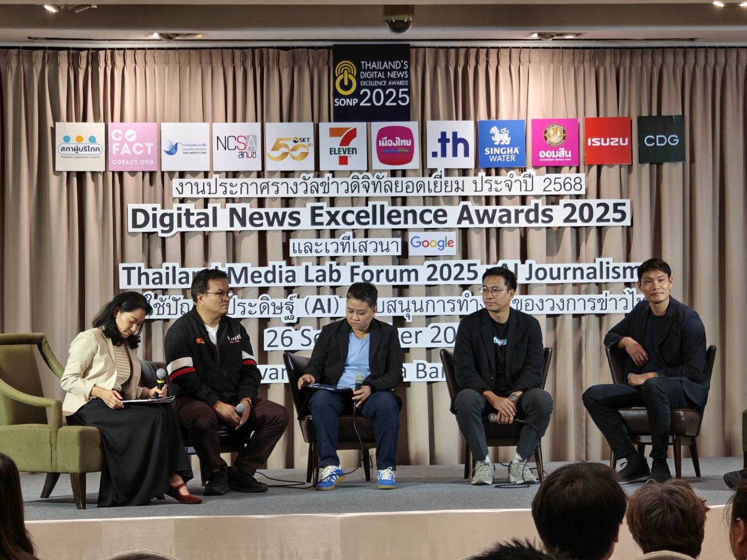 วันศุกร์ที่ 26 กันยายน 2568 เมื่อเวลา 13.00 – 16.30 น. ณ ห้องพลาตินั่ม ชั้น 3 โรงแรม อวานี รัชดา กรุงเทพฯ สมาคมผู้ผลิตข่าวออนไลน์ ร่วมกับสภาองค์กรผู้บริโภค, โคแฟค (ประเทศไทย), สำนักงานคณะกรรมการการรักษาความมั่นคงปลอดภัยไซเบอร์แห่งชาติ (สกมช), Google, กองทุนพัฒนาสื่อปลอดภัยและสร้างสรรค์, บริษัท ซีพี ออลล์ จำกัด (มหาชน), บริษัท ตรีเพชรอีซูซุเซลส์ จำกัด, บริษัท บุญรอด เทรดดิ้ง จำกัด, บริษัท เมืองไทยประกันชีวิต จำกัด (มหาชน), กลุ่มบริษัทซีดีจี, ธนาคารออมสิน, ตลาดหลักทรัพย์แห่งประเทศไทย, และ บริษัท ที.เอช.นิค จำกัด ได้จัดโครงการประกวด “ข่าวดิจิทัลยอดเยี่ยม ประจำปี 2568” (Digital News Excellence Awards 2025) เพื่อส่งเสริมสื่อมวลชนออนไลน์ ที่มีความทุ่มเทในการทำงาน สร้างสรรค์และพัฒนาวงการข่าวออนไลน์ โดยการผลิต “ข่าวดิจิทัลคุณภาพ” ตรงกับมาตรฐานวิชาวารสารศาสตร์ จริยธรรม และจรรยาบรรณวิชาชีพ จึงได้มีการจัดให้มีงานประกาศผล มอบรางวัลพร้อมมอบโล่เกียรติยศ และเวทีเสวนา ร่วมกับ Google หัวข้อ Thailand Media Lab Forum 2025 : AI Journalism การใช้ปัญญาประดิษฐ์ (AI) สนับสนุนการทำงานของวงการข่าวไทย ดำเนินรายการโดยศาสตราจารย์ พิจิตรา ศุภสวัสดิ์กุล นักวิจัยประจำสถาบันเอเชียศึกษา จุฬาลงกรณ์มหาวิทยาลัย ทั้งนี้ในการเสวนามีการแชร์ความคิดเห็นหลากหลายในหลายๆคำถามที่นำมาถกกัน ดังนี้