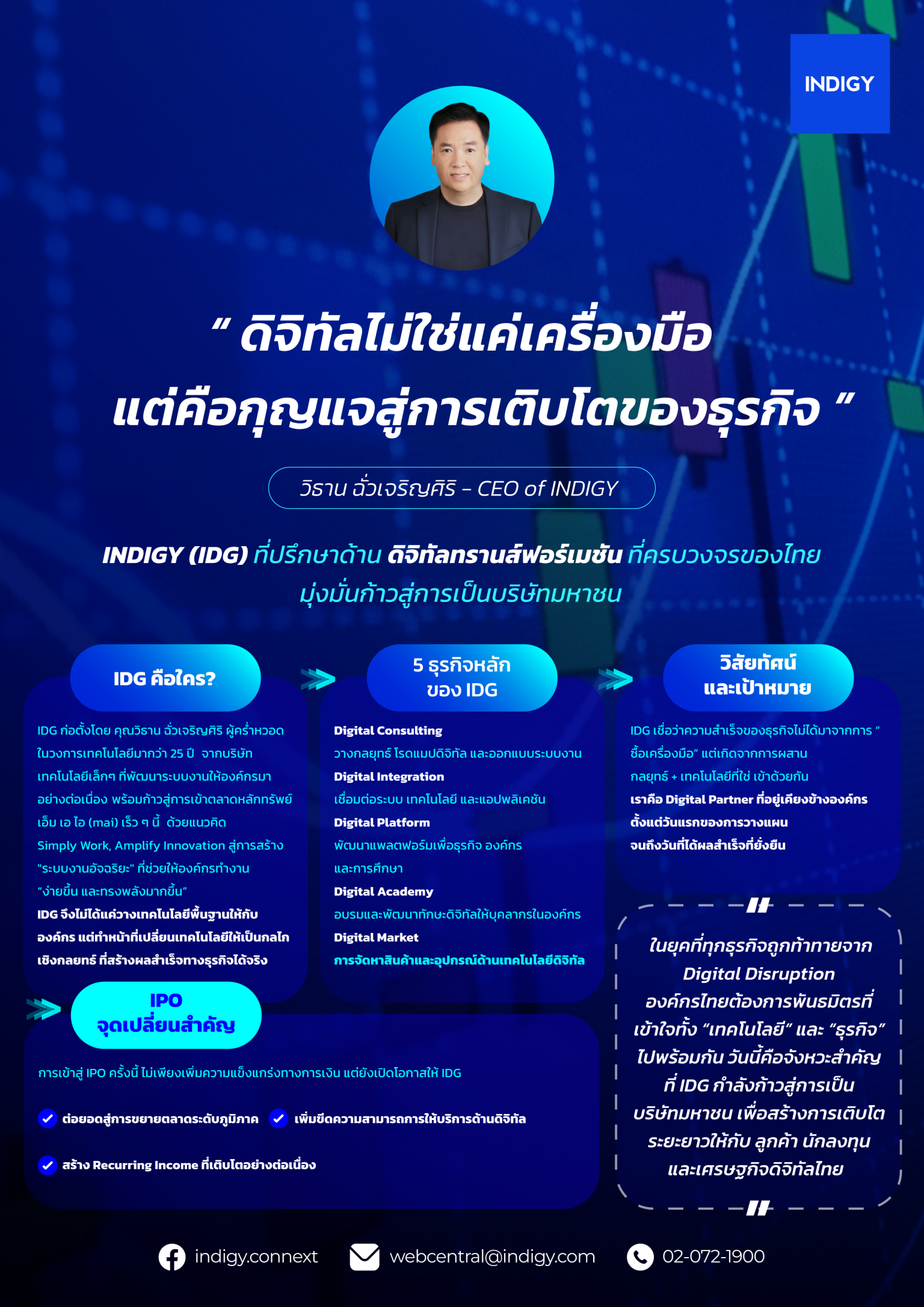 นี่คือหัวใจของ IDG บริษัทเทคโนโลยีสัญชาติไทย ที่เตรียมพร้อมจดทะเบียนเข้าตลาดหลักทรัพย์ เอ็ม เอ ไอ (mai) ด้วยการเสนอขายหุ้นต่อประชาชนเป็นครั้งแรก (IPO) จำนวนไม่เกิน 28 ล้านหุ้น เพื่อนำเงินทุนไปใช้สำหรับการวิจัยและพัฒนาผลิตภัณฑ์ ขยายสำนักงานและศูนย์บริการธุรกิจดิจิทัล รวมถึงใช้เป็นเงินทุนหมุนเวียนของบริษัท เพื่อรองรับแผนขับเคลื่อนธุรกิจและรองรับการเติบโตในอนาคต ในวันนี้ IDG มีความพร้อมเต็มที่ กับการเข้ามาระดมทุนและโลดแล่นอย่างแข็งแกร่งในตลาดทุนไทย หลังจากสั่งสมประสบการณ์มากว่า 25 ปี ในการช่วยองค์กรไทยและต่างประเทศ ก้าวผ่านการเปลี่ยนแปลงทางเทคโนโลยีมาอย่างต่อเนื่อง