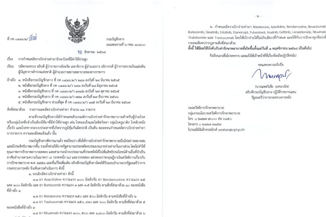 โดยหนังสือดังกล่าวมีเนื้อหาว่า ตามที่กรมบัญชีกลางได้กำหนดหลักเกณฑ์การเบิกจ่ายค่ารักษาพยาบาลสำหรับผู้ป่วยโรคหรือกลุ่มโรค ซึ่งจำเป็นต้องใช้ยาที่มีค่าใช้จ่ายสูง เช่น โรคมะเร็งและโลหิตวิทยา กลุ่มโรครูมาติก โรคผิวหนังเรื้อรัง และโรคทางระบบประสาทที่เกิดจากภูมิคุ้มกันผิดปกติ เป็นต้น ตลอดจนกำหนดอัตราเบิกจ่ายค่ายาบางรายการ ความละเอียดแจ้งแล้ว นั้น