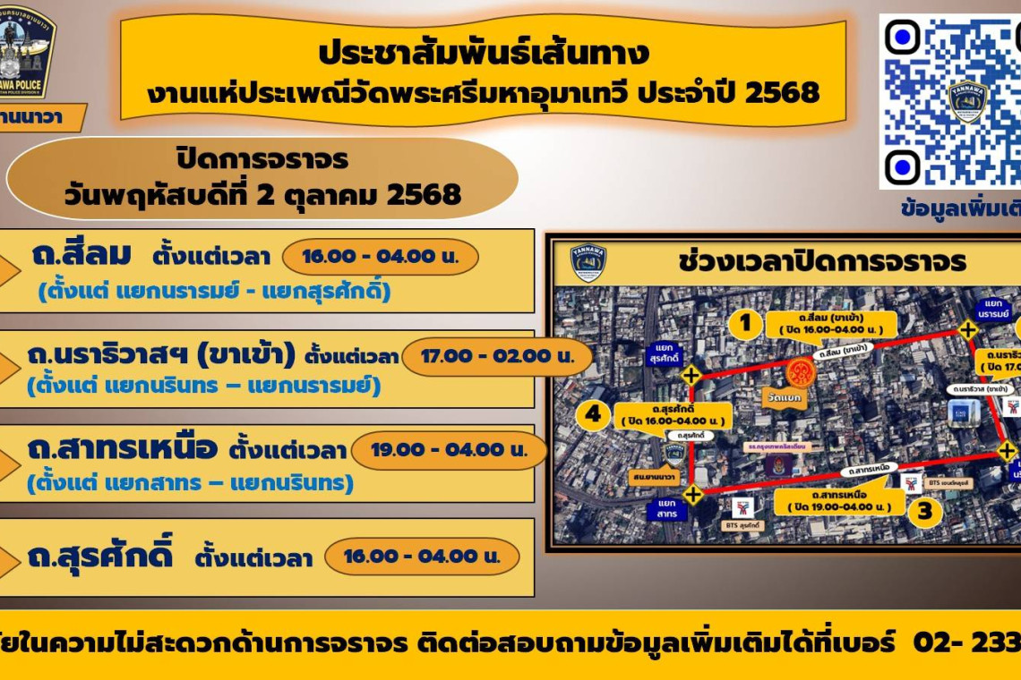 วันที่ 30 ก.ย.68 สถานีตำรวจนครบาลยานนาวา ขอประชาสัมพันธ์เส้นทางงานแห่ประเพณี วัดพระศรีมหาอุมาเทวี (วัดแขก สีลม) ประจำปี 2568 ในวันพฤหัสบดีที่ 2 ตุลาคม 2568