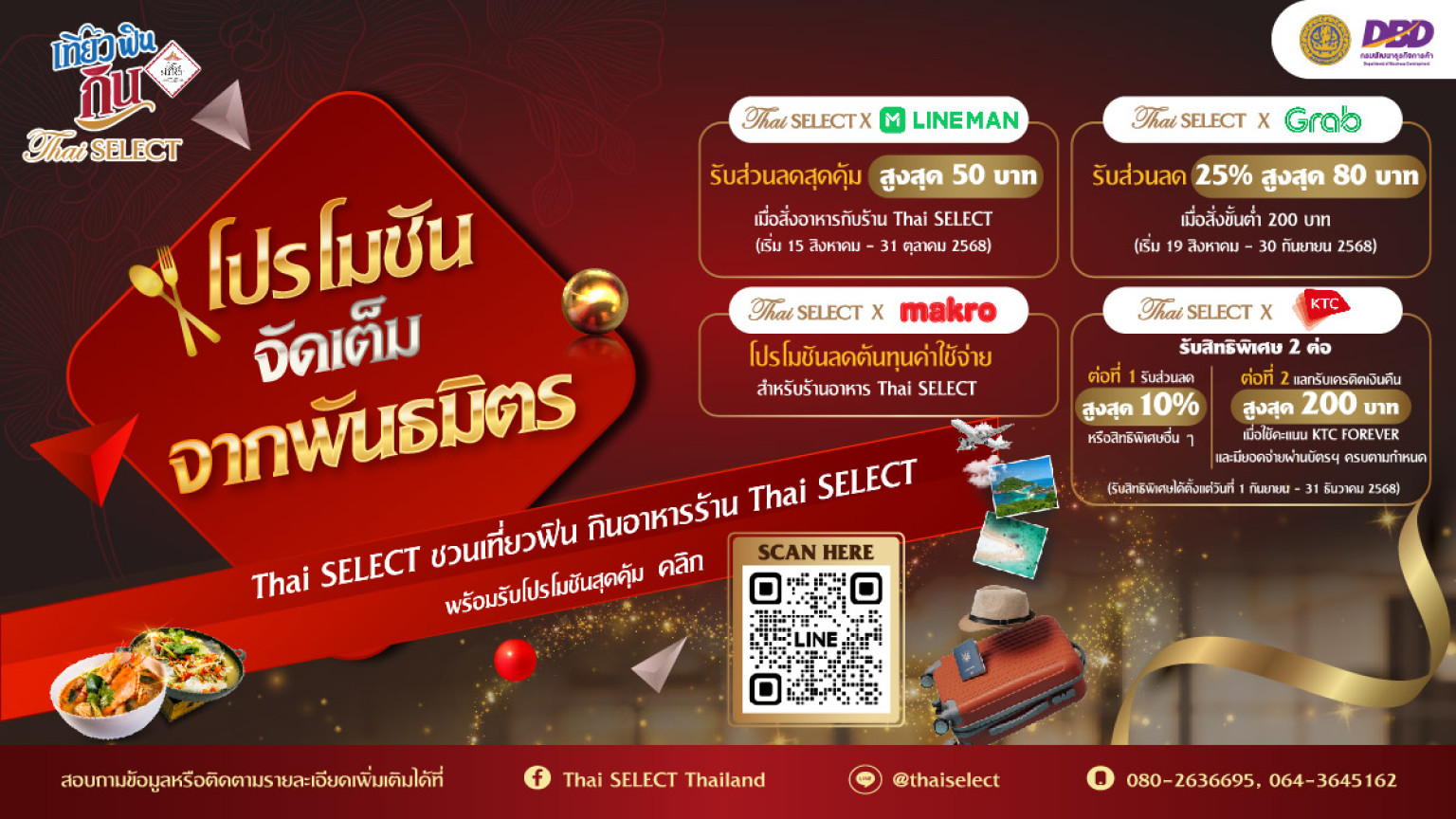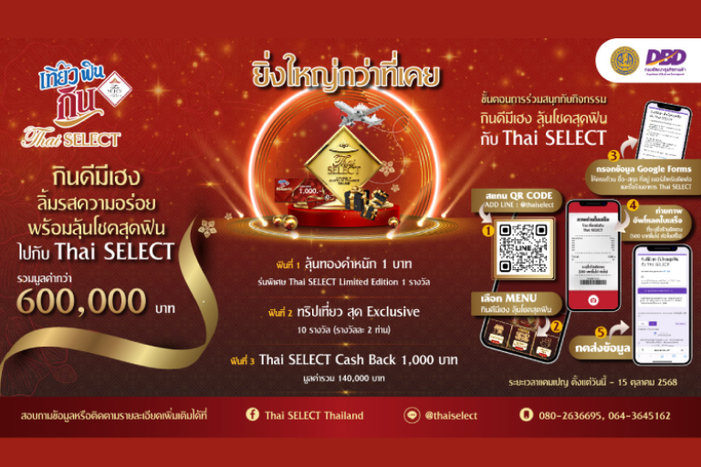 นอกจากนี้ ยังมอบโชคใหญ่สำหรับสายกิน สายเที่ยว ที่มารับประทานอาหาร ณ ร้านอาหารที่ได้รับตราสัญลักษณ์ Thai SELECT ทั่วประเทศ กับกิจกรรม ‘กินดีมีเฮง’ ลิ้มรสความอร่อยพร้อมลุ้นโชคสุดฟินคูณสาม รวมมูลค่ากว่า 600,000 บาท ได้แก่ ฟินที่ 1 ลุ้นทองคำหนัก 1 บาท ซึ่งเป็นรุ่นพิเศษ Thai SELECT Limited Edition ฟินที่ 2 ทริปท่องเที่ยวสุดเอ็กซ์คลูซีฟตามรอยร้าน Thai SELECT และ ฟินที่ 3 Thai SELECT Cash Back รับสิทธิ์ลุ้น Cash Back รวมมูลค่ากว่า 140,000 บาท เพียงรับประทานอาหารที่ร้าน Thai SELECT ครบ 500 บาทขึ้นไป และส่งภาพใบเสร็จ พร้อมกรอกรายละเอียดตามแบบฟอร์มที่ LINE Official Account: @thaiselect โดยใบเสร็จ 1 ใบ ลุ้นโชคได้ 1 สิทธิ์ สามารถส่งใบเสร็จร่วมกิจกรรมได้ไม่จำกัดจำนวนครั้ง ตั้งแต่วันนี้ ไปจนถึงวันที่ 15 ตุลาคม 2568