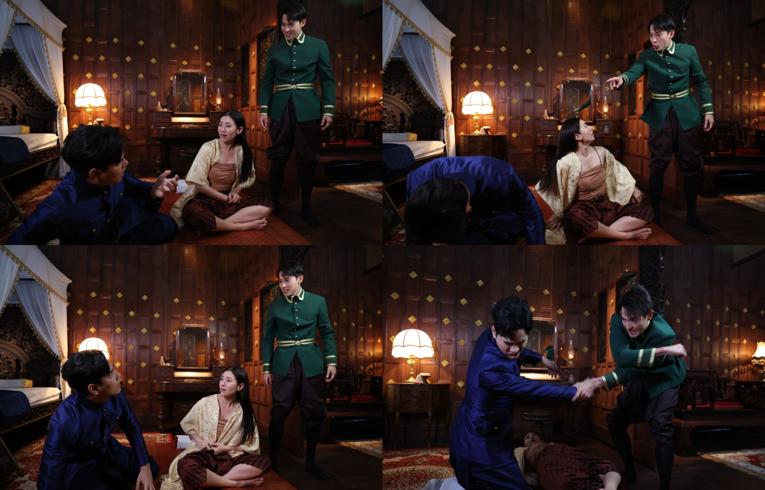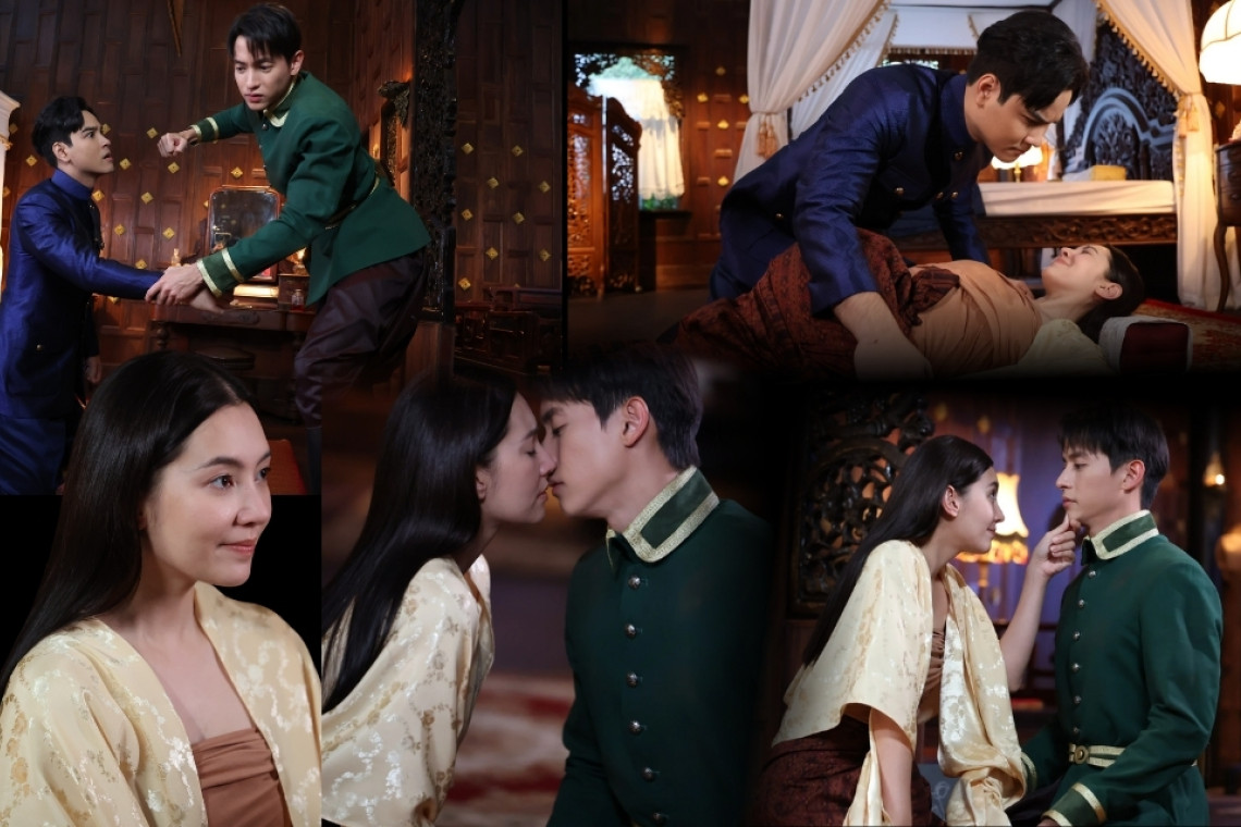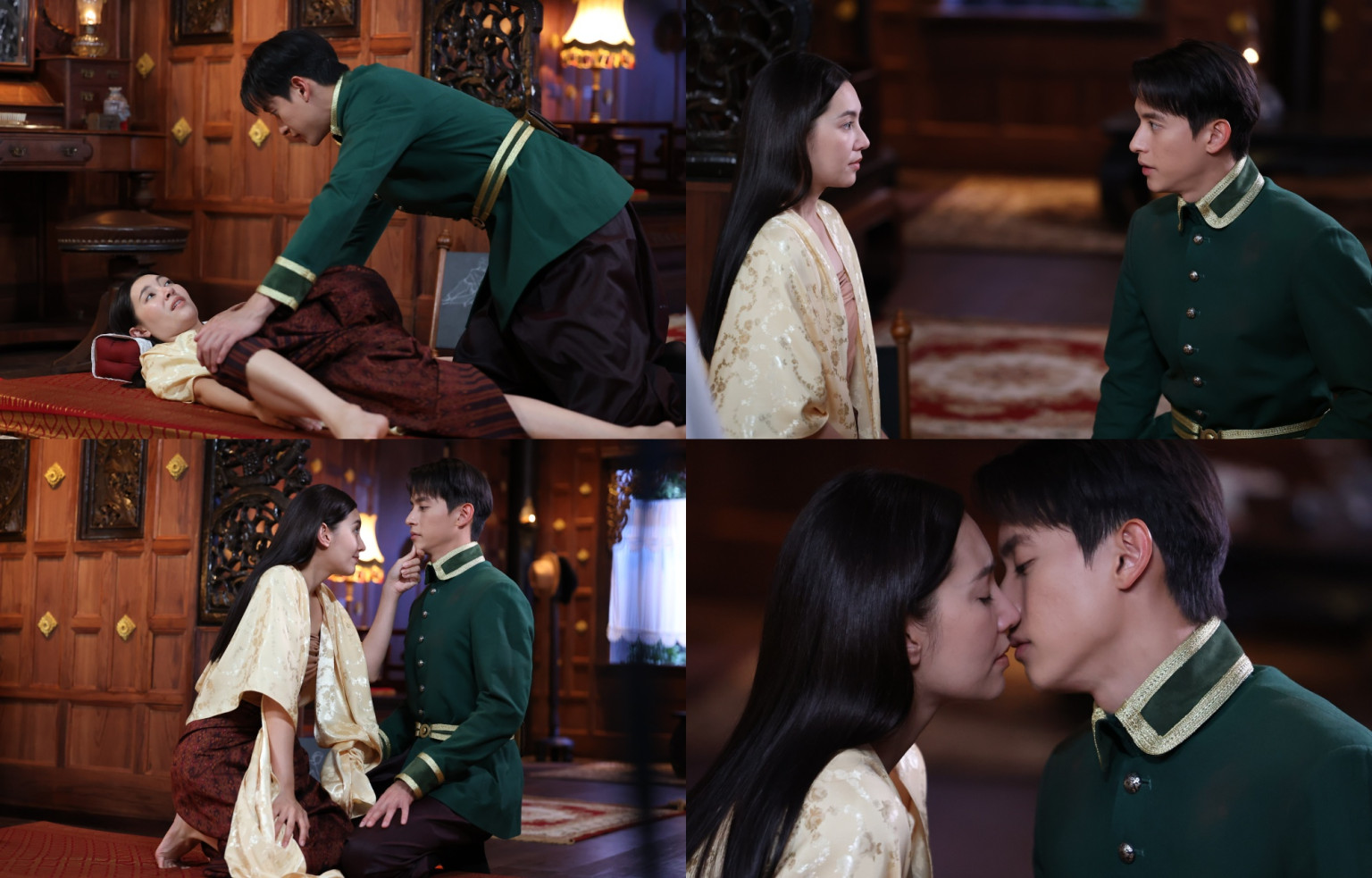 เบื้องหลังการถ่ายทำฉากนี้ก็ครึกครื้นไม่แพ้กัน เมื่อเจมส์และโบ๊ทผลัดกันขายมุกใส่ผู้กำกับ “พี่วิทย์ วรวิทย์” จนกองถ่ายสนุกสนานกันทั้งวัน ส่วนเบลล่าเผยแบบขำ ๆ ว่า “ฉากนี้นอนสบายสุด เพราะได้ทั้งเจมส์และโบ๊ทช่วยนวดจริง ๆ แถมทั้งคู่ก็น้ำหนักมือดี รู้เส้น” และความพีคของฉากนี้อยู่ตรงที่ หลังเหตุชุลมุนจบลง เบลล่าหันมาถามเจมส์แบบตรง ๆ ว่า “นี่หึงหรือเปล่าเจ้าคะ?” งานนี้แม่คำดวงสายรุกไม่ปล่อยให้คุณพี่หนี รีบสบตาและจับคาง ก่อนจะปิดด้วยจังหวะใกล้ชิดที่แฟนละครต้องลุ้นกันว่า จะเป็นแค่การแสดงหรือ “จูบจริง” ให้ใจเต้นแรงกันแน่