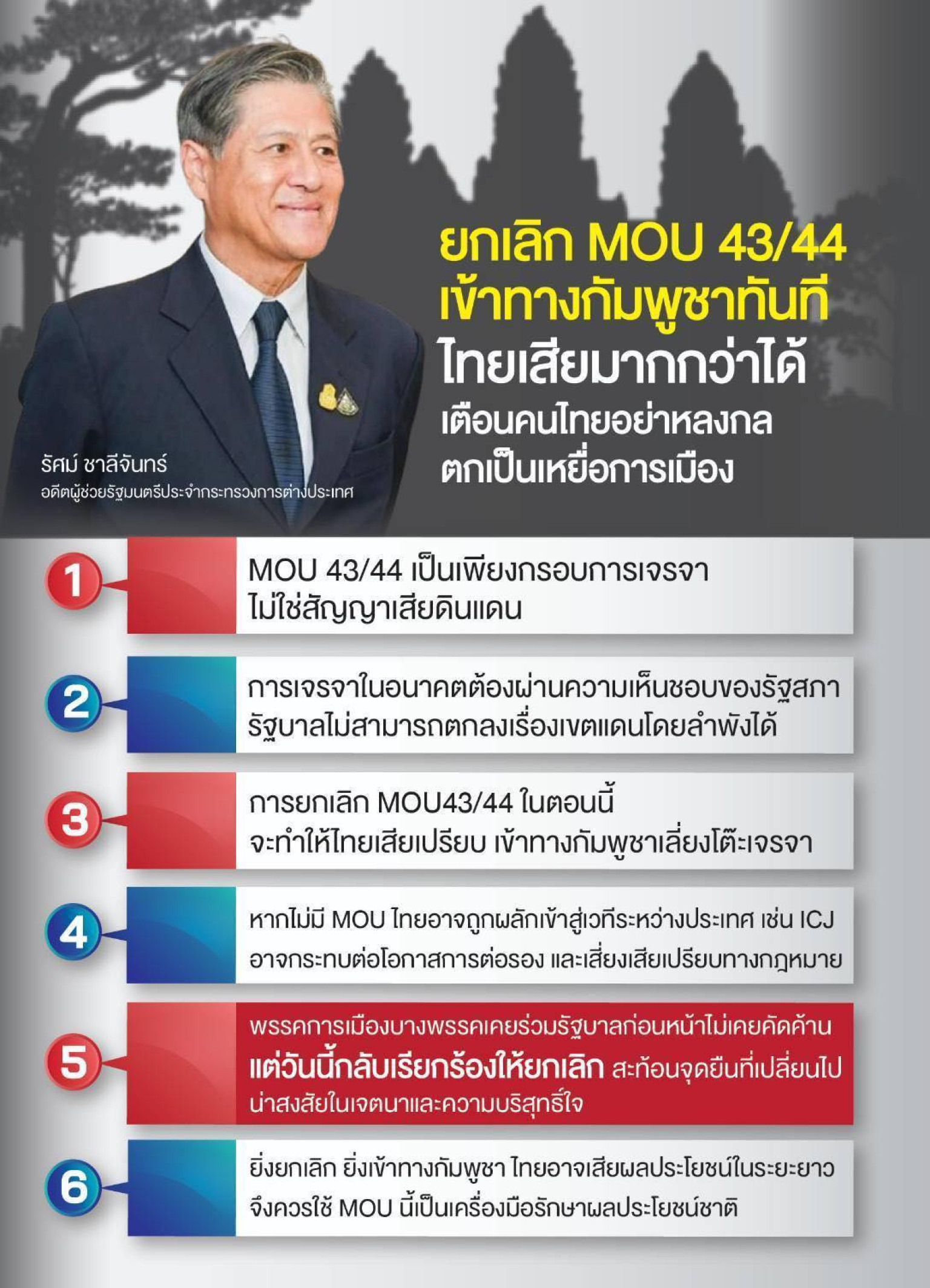 3. การยกเลิก MOU43/44 ในตอนนี้ จะทำให้ไทยเสียเปรียบ เข้าทางกัมพูชาเลี่ยงโต๊ะเจรจา