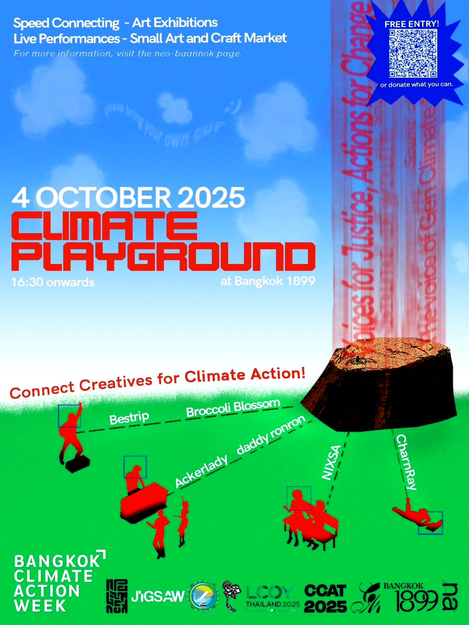 จึงขอเชิญชวนทุกภาคส่วนร่วมงาน Climate Playground: Connect Creatives for Climate Action จะจัดขึ้นในวันเสาร์ที่ 4 ตุลาคม 2025 ตั้งแต่เวลา 16.30 น. เป็นต้นไป ณ Bangkok 1899