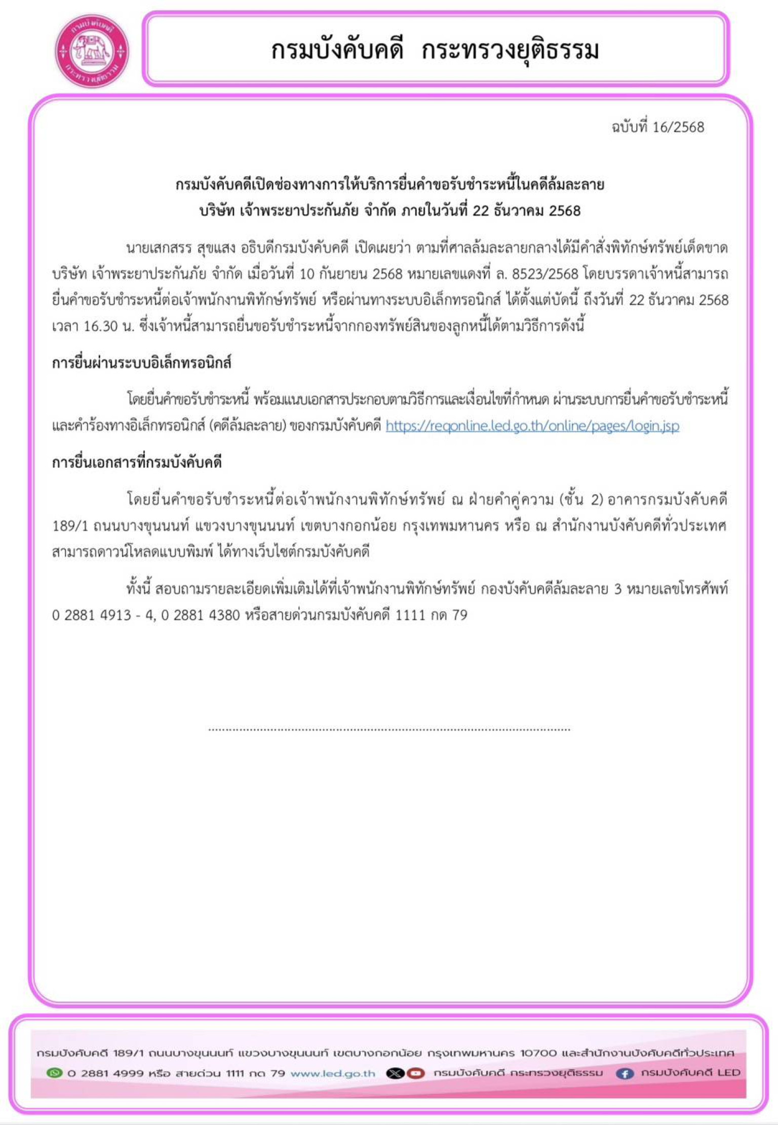นายเสกสรร สุขแสง อธิบดีกรมบังคับคดี เปิดเผยว่า ตามที่ศาลล้มละลายกลางได้มีคำสั่งพิทักษ์ทรัพย์เด็ดขาด บริษัท เจ้าพระยาประกันภัย จำกัด เมื่อวันที่ 10 กันยายน 2568 หมายเลขแดงที่ ล. 8523/2568 โดยบรรดาเจ้าหนี้สามารถยื่นคำขอรับชำระหนี้ต่อเจ้าพนักงานพิทักษ์ทรัพย์ หรือผ่านทางระบบอิเล็กทรอนิกส์ ได้ตั้งแต่บัดนี้ ถึงวันที่ 22 ธันวาคม 2568 เวลา 16.30 น. ซึ่งเจ้าหนี้สามารถยื่นขอรับชำระหนี้จากกองทรัพย์สินของลูกหนี้ได้ตามวิธีการดังนี้