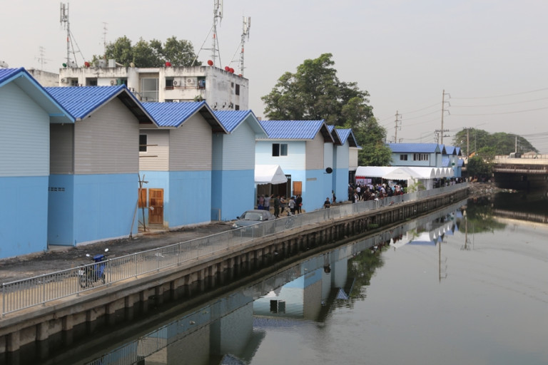 ตามที่รัฐบาลมีนโยบายแก้ไขปัญหาชุมชนที่บุกรุกพื้นที่ริมคลองในกรุงเทพมหานคร โดยมอบหมายให้กระทรวงการพัฒนาสังคมและความมั่นคงของมนุษย์ และสถาบันพัฒนาองค์กรชุมชน (องค์การมหาชน) จัดทำแผนงาน “บ้านประชารัฐริมคลอง” เพื่อรองรับที่อยู่อาศัยของประชาชนริมคลองที่ต้องรื้อย้ายบ้านออกจากแนวก่อสร้างเขื่อนระบายน้ำ และให้กรุงเทพมหานครรับผิดชอบในการสร้างเขื่อนระบายน้ำเพื่อป้องกันน้ำท่วม ทั้งนี้การรื้อย้ายบ้านนอกจากแนวคลองและการสร้างบ้านใหม่ได้เริ่มดำเนินการไปแล้วหลายชุมชนตั้งแต่ช่วงปี 2559 ที่ผ่านมา โดยในขณะนี้มีชุมชนที่รื้อย้ายบ้านเรือนออกจากแนวคลองและสร้างบ้านใหม่ในชุมชนเดิมเสร็จทั้งชุมชนแล้ว 1 ชุมชน คือชุมชนศาลเจ้าพ่อสมบุญ จำนวน 65 หลัง